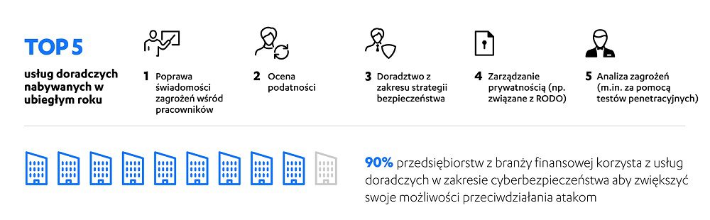 90% firm z branży korzysta przy tym z usług doradczych w zakresie cyberbezpieczeństwa. Najczęściej obejmują one zwiększanie świadomości dot. zagrożeń wśród pracowników, ocenę podatności, strategie bezpieczeństwa, zarządzanie prywatnością (m.in. w kontekście RODO) oraz analizę zagrożeń, prowadzoną m.in. przez tzw. etycznych hakerów.