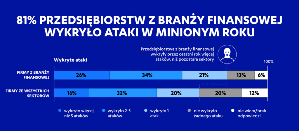 81% przedsiębiorstw z branży finansowej w ciągu ostatnich 12 miesięcy wykryło cyberatak, którego padły ofiarą, a 26% odkryło ich więcej niż 5 (w porównaniu z odpowiednio 68% i 16% w pozostałych sektorach).