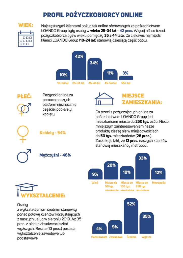 Loando Group: W sierpniu pośredniczyło w udzieleniu ponad 21 tys. pożyczek online. Większość zobowiązań zaciągnięto za pomocą urządzeń mobilnych. Z usług Loando Group korzystały głównie młode (25-34 lat) kobiety, absolwentki szkół średnich, zamieszkujące miasta do 250 tys mieszkańców. Aż 87% klientów porównywarek pożyczkowych zrzeszonych w Loando Group spłaciło swoje zobowiązania, których termin ostatecznej realizacji został wyznaczony na sierpień 2019.Źródło: spółka