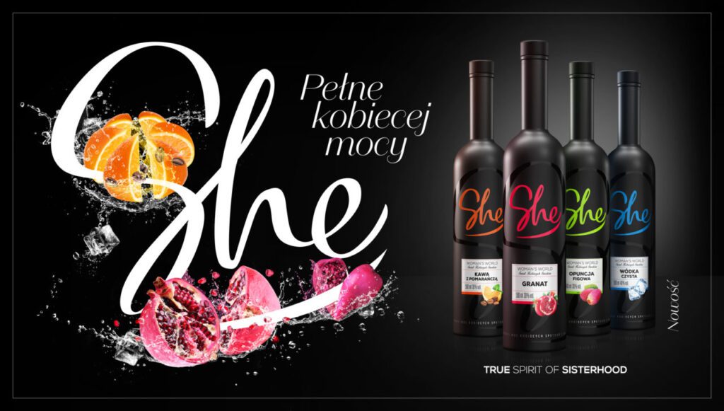 H2O Creative: Pod hasłem „Pełne kobiecej mocy” wprowadza na rynek nową markę alkoholi dla kobiet – SHE z portfolio BZK Alco. Źródło: spółka