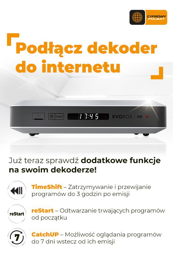 Cyfrowy Polsat: Jako pierwsza platforma satelitarna w Polsce, uruchomił testowo na satelitarnych dekoderach EVOBOX HD nowe funkcje, dostępne po podłączeniu urządzenia do Internetu, które umożliwiają oglądanie ulubionych programów z przesunięciem czasowym: TimeShift, reStart i CatchUP. Źródło: spółka