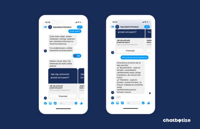 Polski startup Chatbotize stworzył chatbota, który automatycznie odpowiada na najważniejsze i najczęściej powtarzające się pytania związane z epidemią koronawirusa. Chatbot dostępny jest na oficjalnym profilu Kancelarii Premiera na Facebooku.