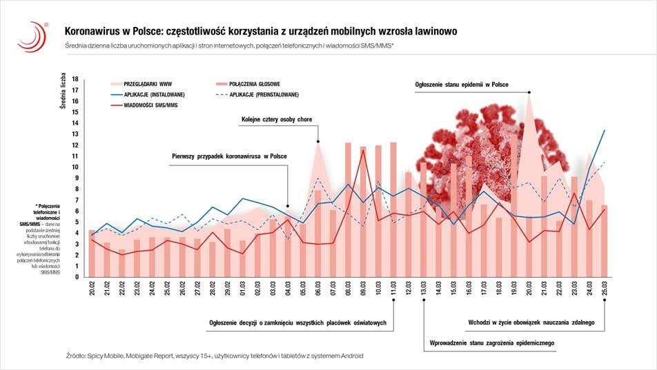 Telekomunikacja: Jak wynika z badania Spicy Mobile od momentu pojawienia się pierwszego w Polsce przypadku zarażenia koronawirusem aktywność Polaków na urządzeniach mobilnych wzrosła skokowo. Liczba połączeń telefonicznych podwoiła się, a wiadomości SMS wzrosła o niemal 80%. Źródło: spółka