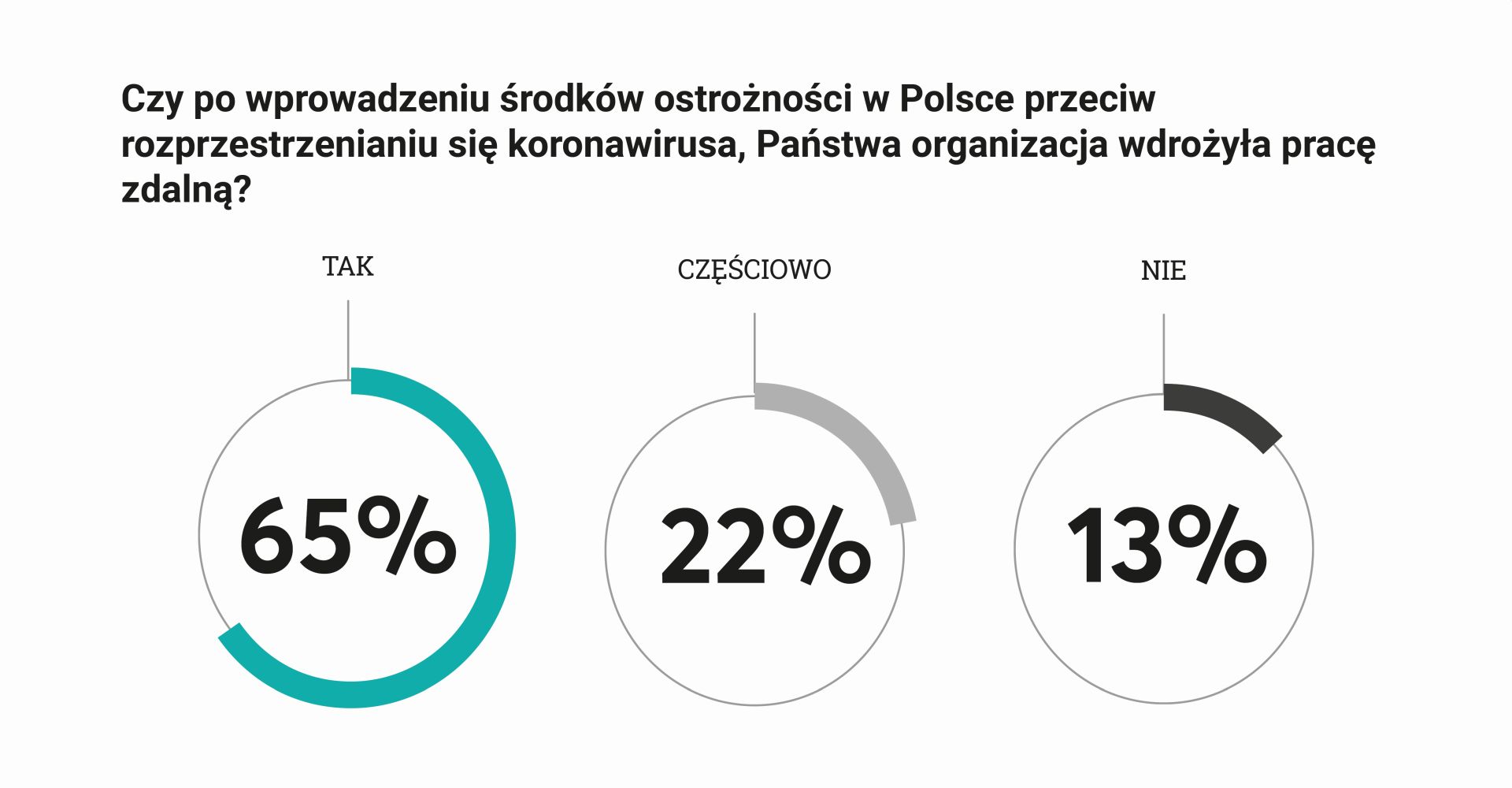 Praca zdalna: 63% badanych pracowników przyznało, że ze względu na epidemię koronawirusa pracodawcy umożliwili im przejście na pracę zdalną. Jednocześnie tylko co trzeci respondent (33%) zadeklarował, że z tego rozwiązania skorzystali wszyscy lub prawie wszyscy pracownicy organizacji. 30% ankietowanych stwierdziło, że niewielka część pracowników wybrała „home office”, choć nie ma obowiązku przebywania w biurze. Powodów takiej decyzji możemy upatrywać w kilku czynnikach, m.in. braku warunków do pracy w domu czy utrudniających pracę problemach technicznych związanych np. z dostępem do szybkiego i stabilnego internetu – wynika z sondażu przeprowadzonego na koniec marca 2020 r. przez InsightOut Lab na zlecenie firmy NEXERA – pierwszego w Polsce operatora hurtowego światłowodowej sieci dostępowej o dużej skali. Źródło: spółka