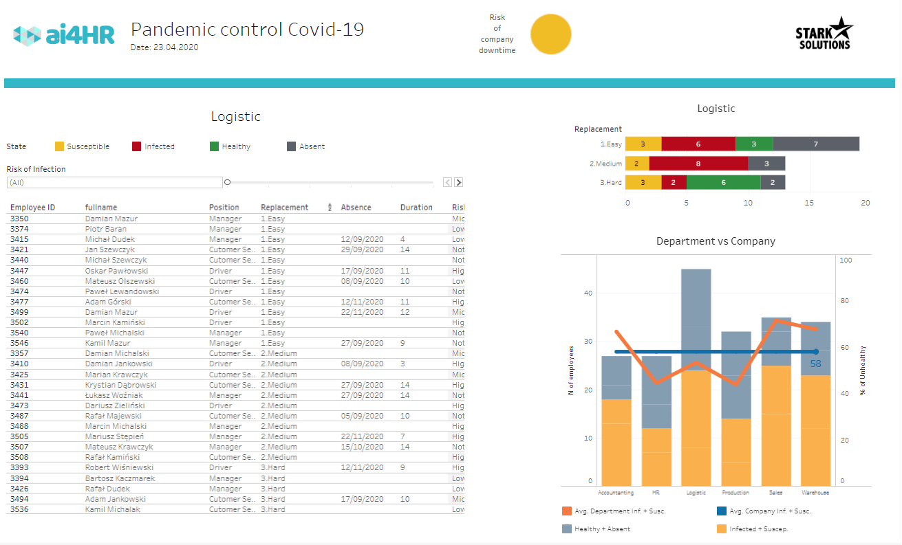 Tabela 2. Ekran produktu ai4HR, używany do przeciwdziałania skutkom pandemii, przykładowe dane z działu produkcji.