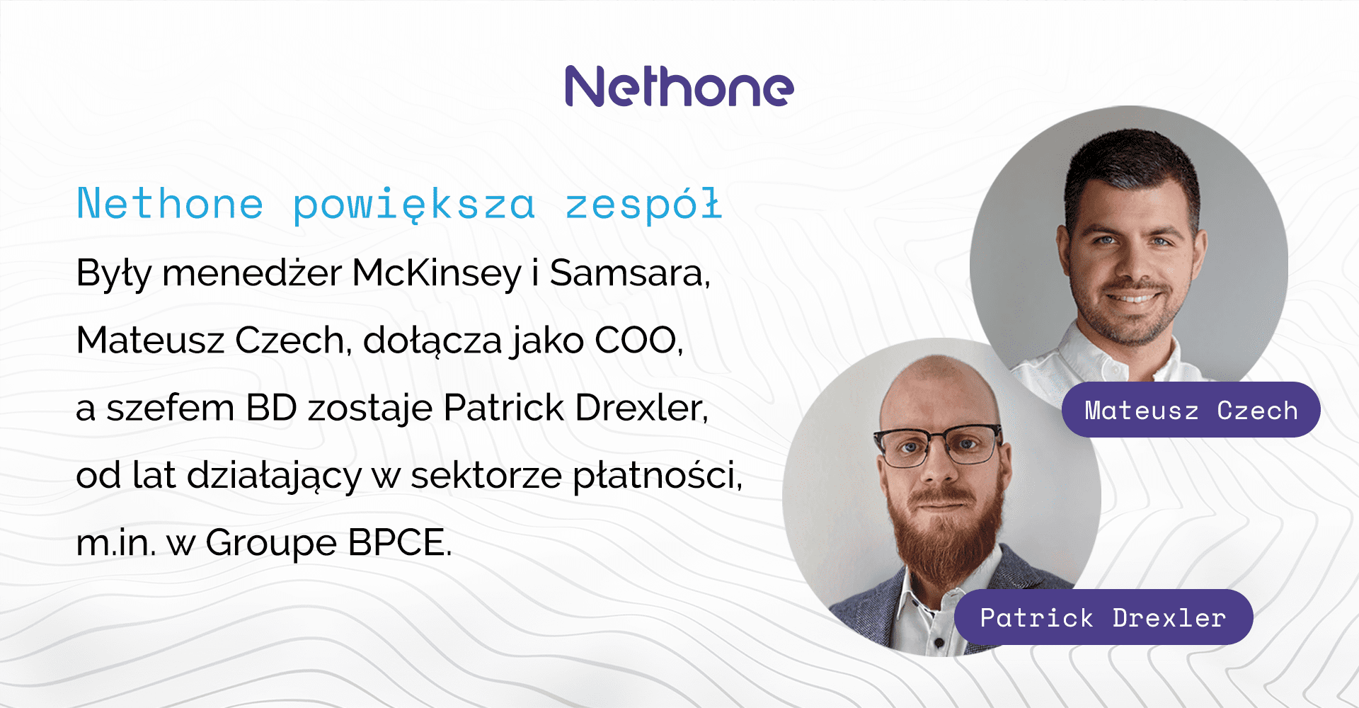 Nethone: Do firmy dołączyli nowi liderzy – były menedżer McKinsey i Samsara, Mateusz Czech jako Chief Operating Officer, a szefem Business Development został Patrick Nickel-Drexler, od lat działający w sektorze płatności, m.in. jako odpowiedzialny za rozwój biznesu w francuskiej grupie bankowej Groupe BPCE. Źródło: spółka