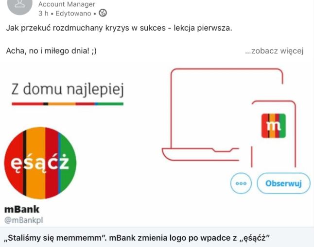 Może mem (przy okazji jakby wyjaśniło się skąd m przed bankiem) po niepokojących push’ach przeprosił, może przekazał poważne wyjaśnienie.. do mnie nie trafiło (choćby nawet push’em)… za to informacje, że bank w którym mam konto z dumą ogłasza, że stał się memem i pijarowe gratulki zdecydowanie zasypały lnkdin.
