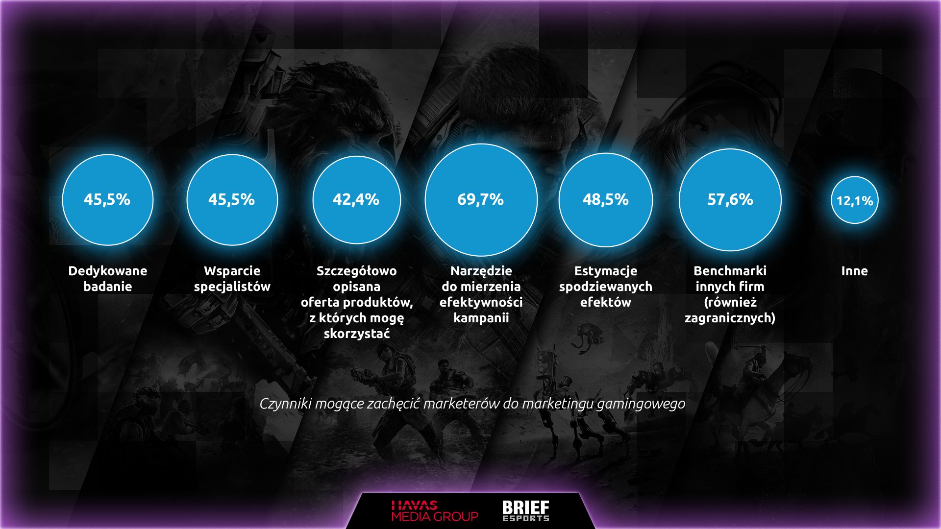 Respondenci wskazali też czynniki, które ich zdaniem mogłyby pomóc w podjęciu decyzji o współpracy z podmiotami w gamingu i esporcie. Zaliczają się do nich: narzędzie do mierzenia efektywności kampanii (69,7%), benchmarki innych firm (57,6%), estymacje spodziewanych efektów (48,5%) czy chociażby dedykowane badania i wsparcie specjalistów (po 45,5%).