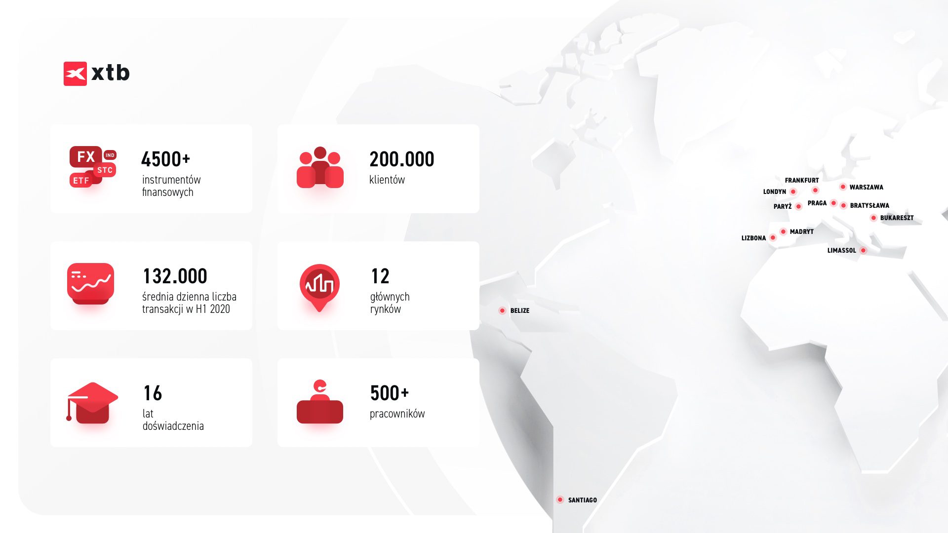 XTB umożliwia obecnie inwestowanie w ponad 2000 prawdziwych akcji z 16 największych światowych giełd, w tym New York Stock Exchange, London Stock Exchange, hiszpańskiej Bolsa de Madrid, niemieckiej Börse Frankfurt oraz oczywiście warszawskiej Giełdy Papierów Wartościowych. Oprócz akcji, XTB oferuje ponad 200 funduszy ETF (Exchange-Traded Funds), w tym na towary, nieruchomości i obligacje. Handel wszystkimi tymi instrumentami z 0% prowizją jest już dostępny dla klientów XTB korzystających z platformy xStation.