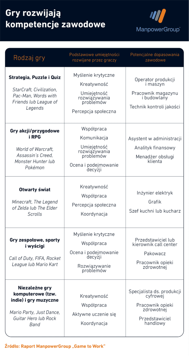 Potencjalne dopasowanie zawodowe takiej osoby to asystent ds. administracyjnych, analityk finansowy lub menedżer w zespole obsługi klienta. W zestawieniu ManpowerGroup znalazły się również między innymi gry zespołowe, sportowe, wyścigowe jak Mario Kart, Rocket League, FIFA czy Call of Duty, które pozwalają doskonalić umiejętność myślenia krytycznego, współpracy, oceny i podejmowania decyzji oraz rozwiązywania problemów. To zdolności szczególnie cenione na takich stanowiskach jak pracownik opieki zdrowotnej, pakowacz, przedstawiciel lub kierownik call center.