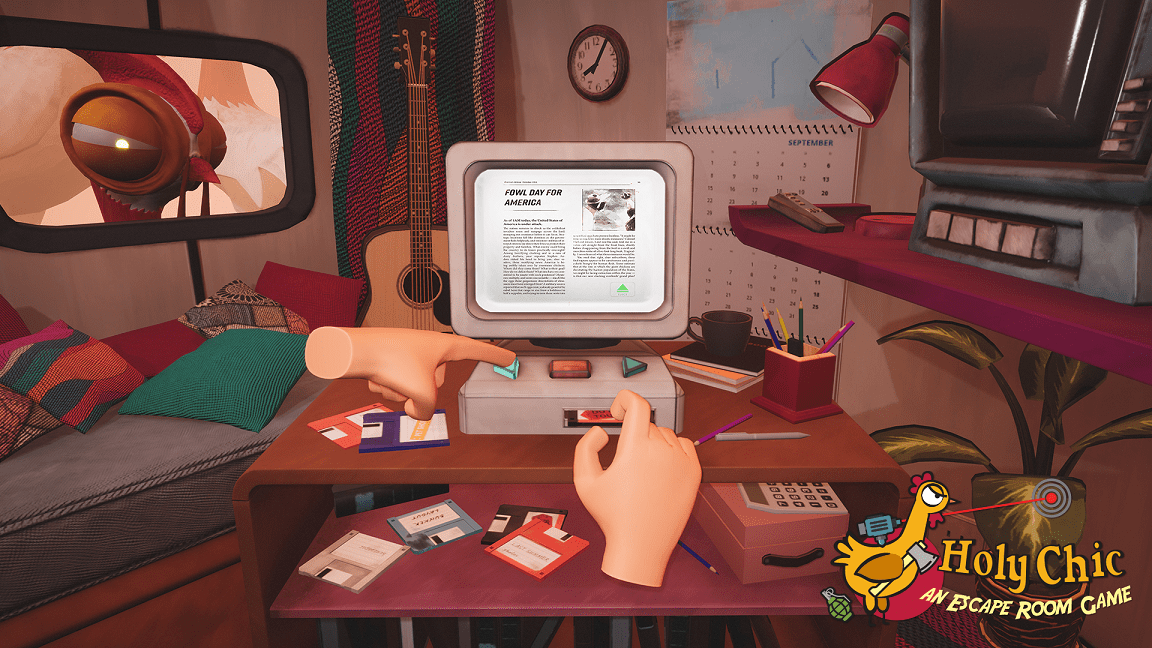 Akcja Holy Chick! an Escape Room Game rozegra się głównie w przyczepie kempingowej. Schronienia gracz będzie mógł szukać m.in. w bunkrze, w którym znajdzie się laboratorium szalonego preppersa. Kolejnym utrudnieniem w ucieczce postaci będzie panel z klawiaturą do wpisania kodu PIN zamocowany na zamkniętej lodówce. Celem rozgrywki jest odlot gracza rakietą na Księżyc.