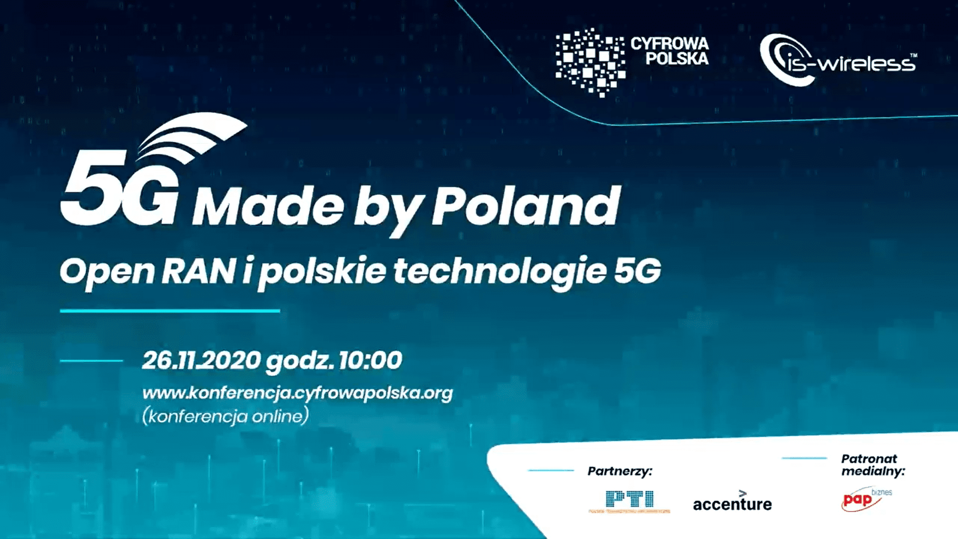 Konferencja „5G Made By Poland: Open RAN i polskie technologie 5G” została zorganizowana wspólnie przez Związek Cyfrowa Polska i firmę IS-Wireless. Partnerami wydarzenia było Polskie Towarzystwo Informatyczne (PTI) oraz firma Accenture.