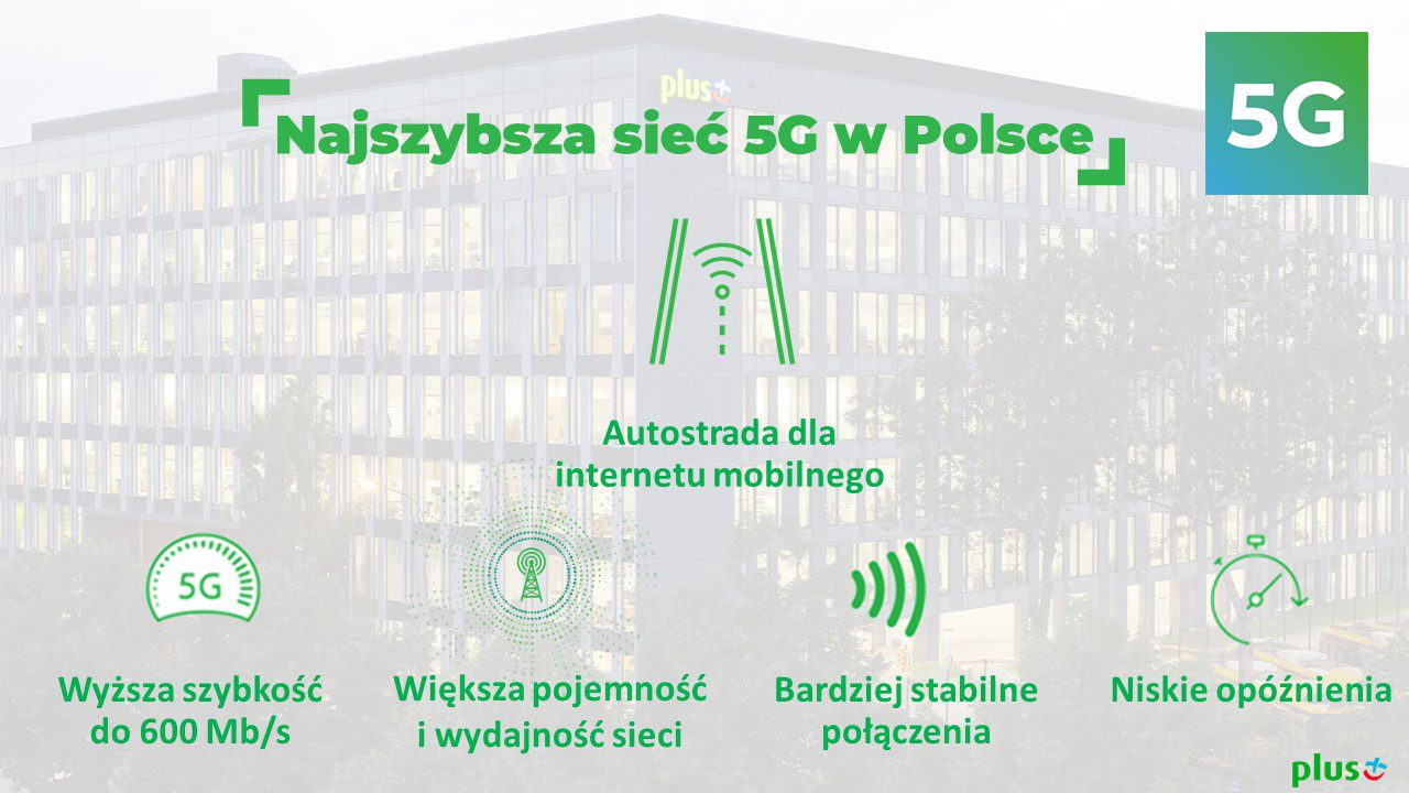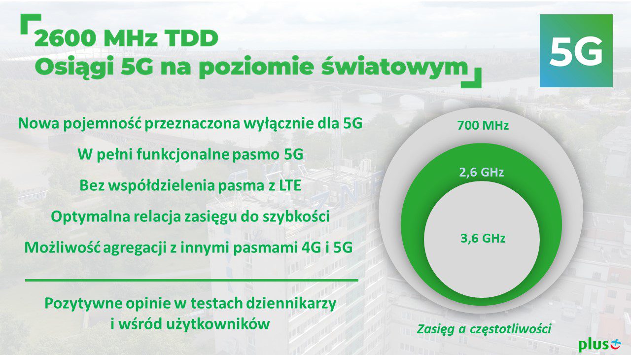 W maju 2020 roku w 7 miastach na 100 nadajnikach ruszyła pierwsza w Polsce sieć 5G Plusa na częstotliwości 2600 MHz TDD. Pozwala osiągać szybkość internetu do 600 Mb/s. Kilkumiesięczne obserwacje doświadczeń użytkowników sieci i najlepsze wyniki uzyskiwane w testach szybkości sieci 5G w porównaniu do innych operatorów, zaowocowały decyzją o poszerzeniu zasięgu sieci. Do listy 7 obecnych miast z 5G dołączy kolejnych ponad 150 miejscowości, dzięki czemu łącznie z najszybszego 5G w Polsce będzie mogło korzystać ponad 11 mln osób.