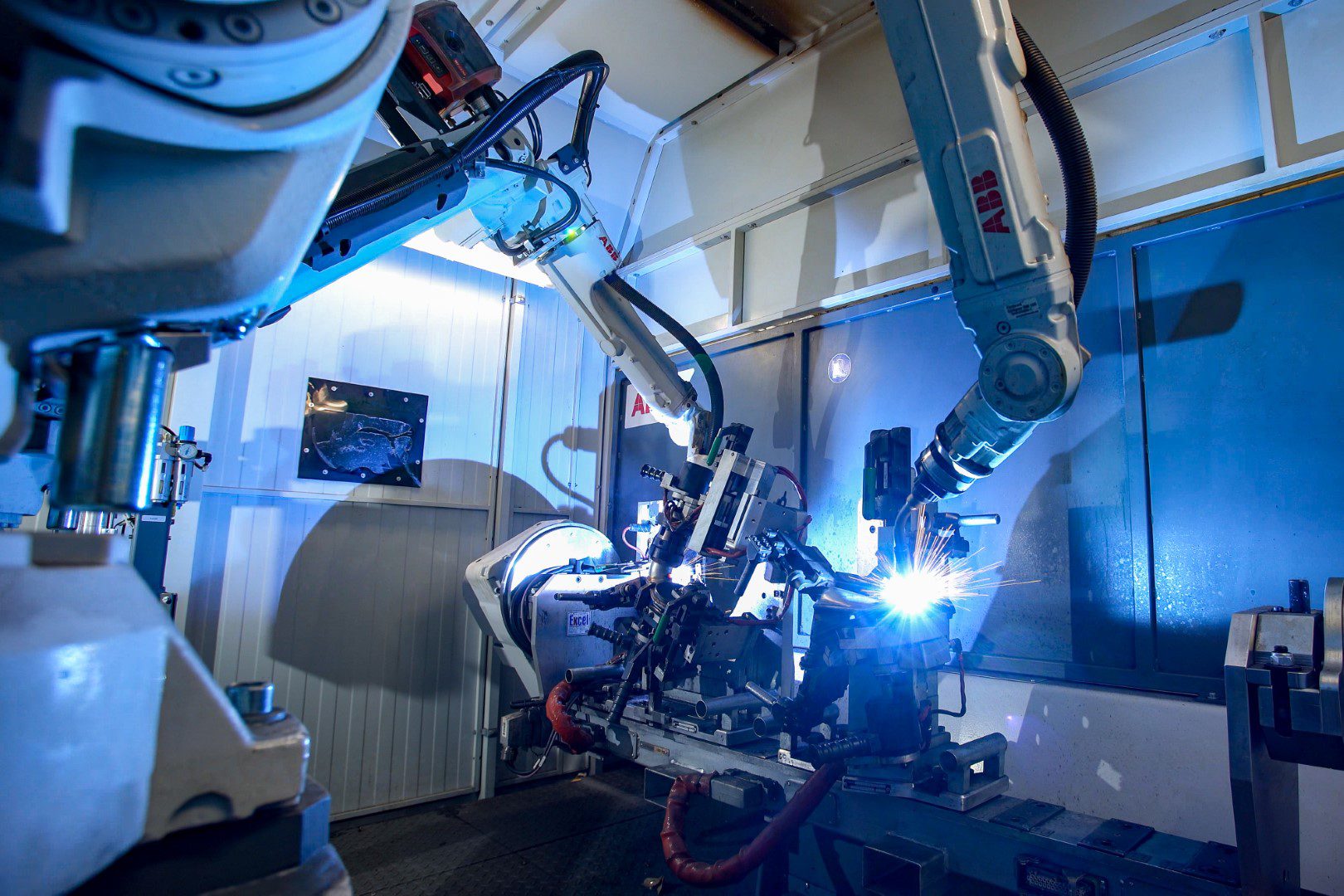 Fabryka w Błoniu wykorzystuje kilka rodzajów cel spawalniczych, ale tylko jeden typ robota spawalniczego: IRB 2600. Z jednej strony pozycjonera operator dostarcza części, a z drugiej robot rozpoczyna spawanie. Po zakończeniu procesu, maszyna zwraca się w stronę operatora, który odbiera produkt i załadowuje nowe części.