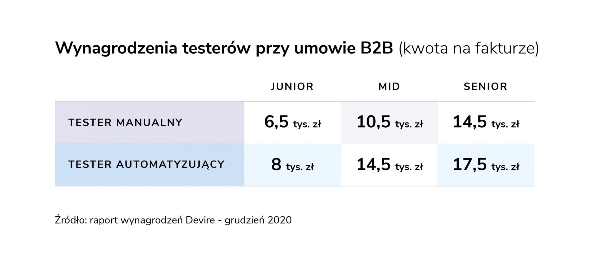 Nawet zarobki najmłodszego stażem juniora (tester manualny) przedstawiają się atrakcyjnie, wynosząc od 5,5 tys. zł brutto przy umowie o pracę do 6,5 tys. zł netto przy własnej działalności gospodarczej. Oczywiście najwięcej zarabiają seniorzy. Ich pensje na kontrakcie wynoszą nawet 14,5 tys. zł netto oraz 17,5 tys. zł brutto przy UoP. Wysokie wynagrodzenia są jednak związane z faktem, że specjaliści na takich stanowiskach są często odpowiedzialni także za planowanie i wdrażanie procesów, rozmowy biznesowe czy negocjacje z klientami, są więc tak naprawdę nie tylko testerami, ale sprawnymi managerami.