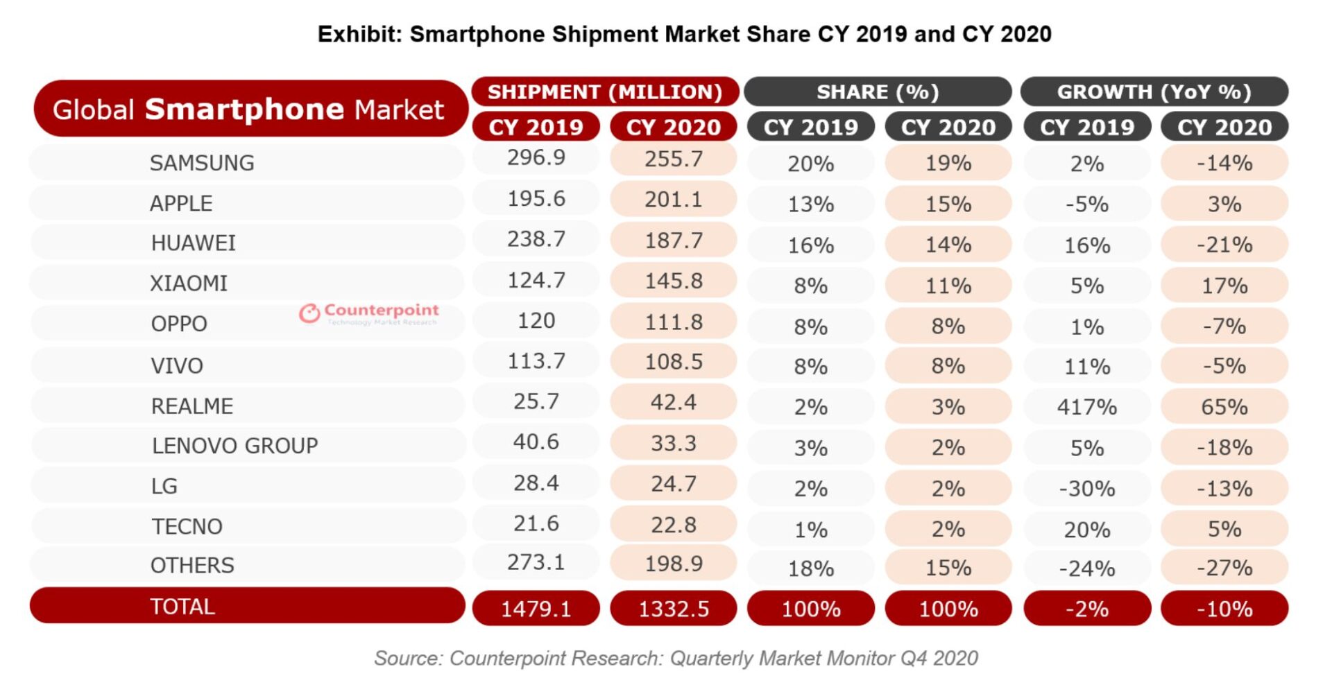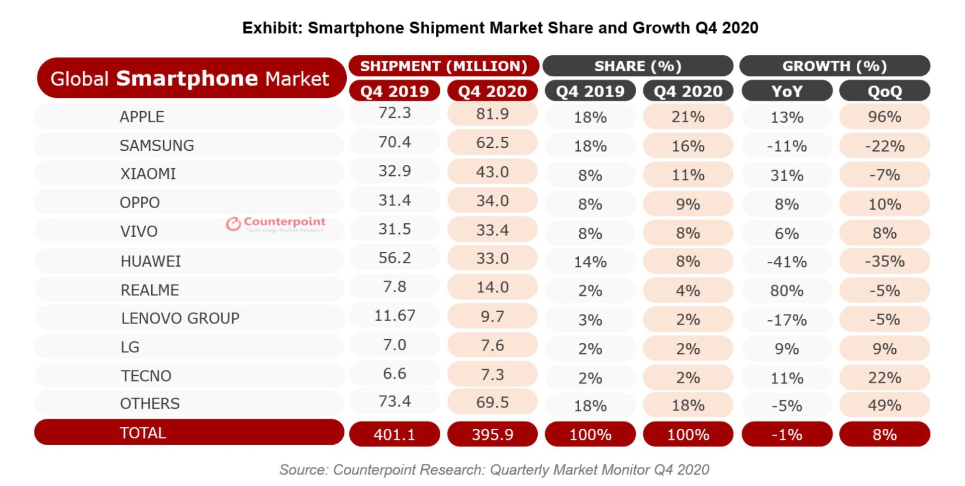 Tabela kwartalna dostaw smartfonów Q4/2019 vs Q4/2020 (Źródło: Counterpoint)