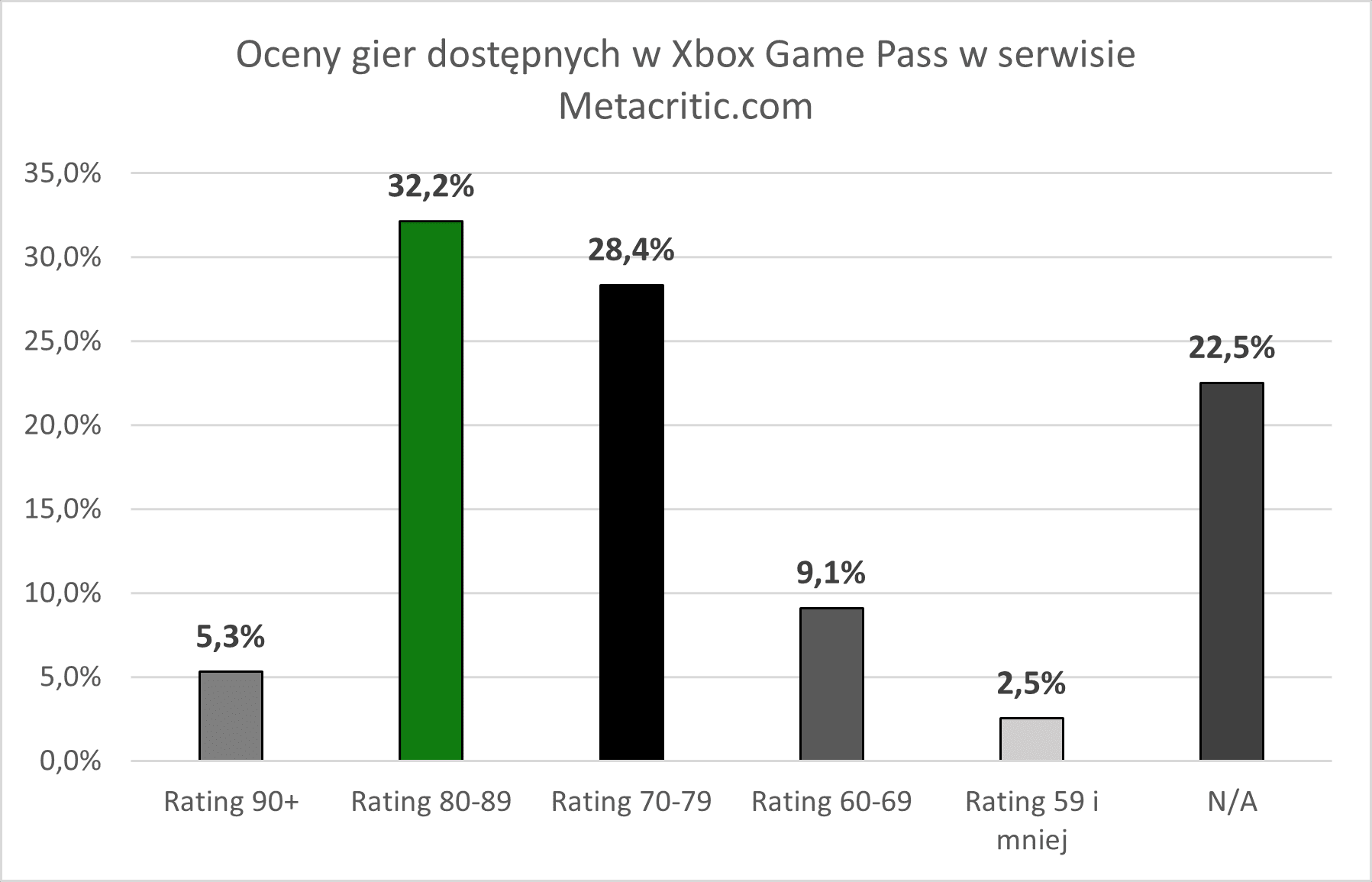 Powyższe statystki mogą robić wrażenie, jednak najważniejsza zawsze pozostaje jakość. Według Wall Street Journnal obiektywne i najbardziej cenione noty gier przyznaje Metacritic.com3. Według danych serwisu aż 37.5 proc. tytułów dostępnych w Game Passie uzyskało ponad 80 punktową ocenę. Natomiast najliczniejszą grupę gier stanowią te oceniane pomiędzy 80 a 89 punktami – jest to 32.2 proc. całego katalogu usługi. Co warte zauważenia, to fakt, iż aż 21 gier z portfolio Game Passa posiada notę 90 punktową lub większą.