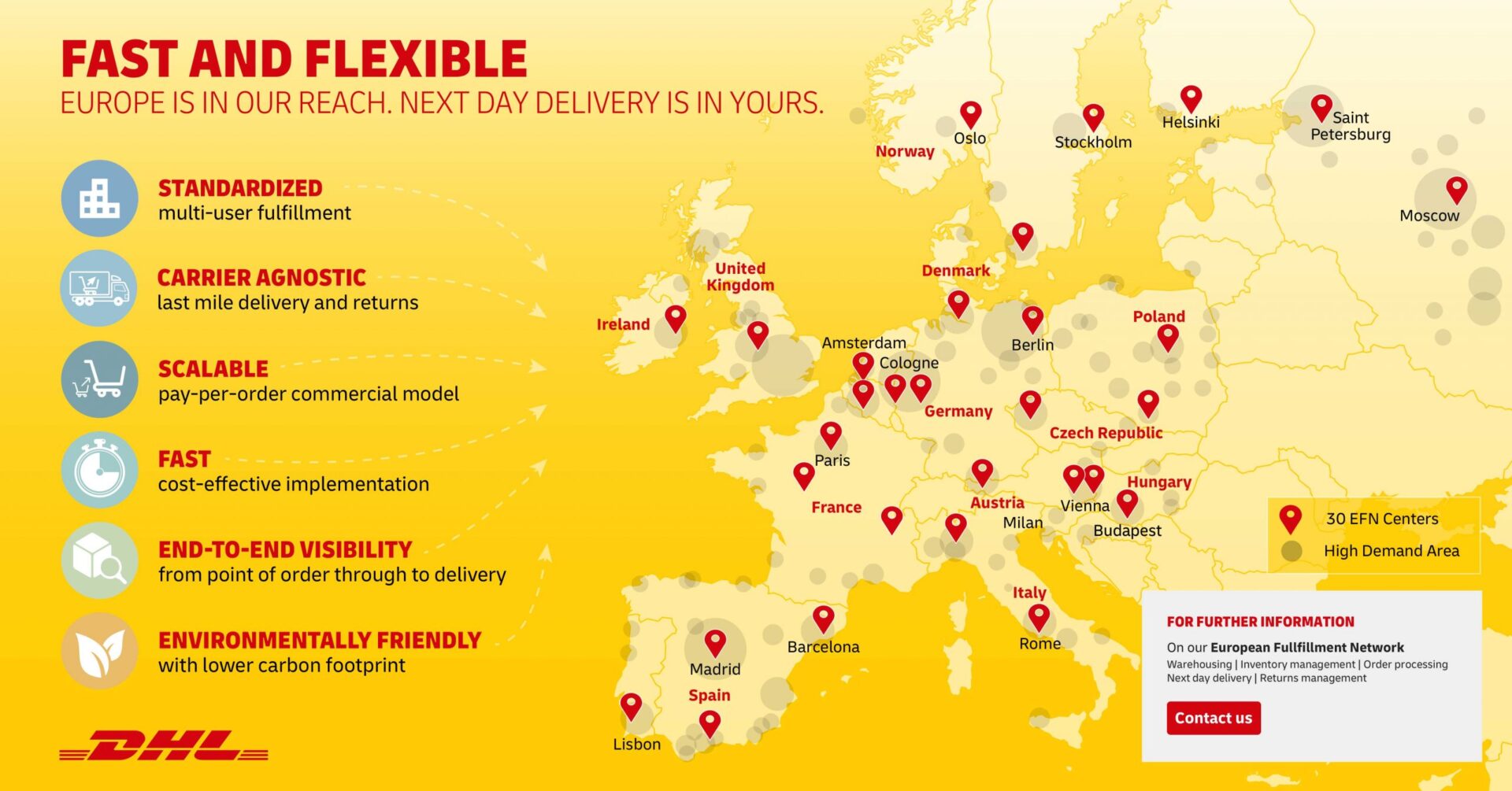 Dzięki obsługiwaniu wielu klientów z centralnie zlokalizowanych obiektów DHL, detaliści i organizacje przyjmujące strategię bezpośredniej sprzedaży do klienta będą mogły korzystać z mocy, jaką oferuje tego rodzaju europejska sieć. Znacząco poprawia ona możliwość szybkiego i przejrzystego realizowania zamówień klientów na bieżąco, jednocześnie zapewniając elastyczność, jakiej potrzebują detaliści.