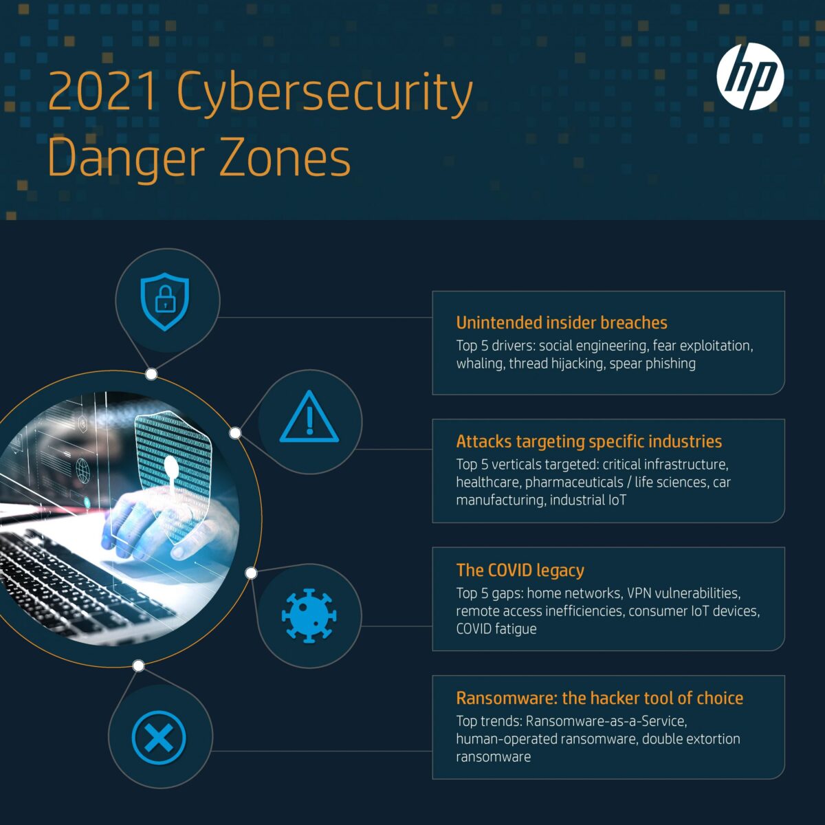 Prawdopodobieństwo wirtualnych zagrożeń będzie w 2021 utrzymywać w napięciu cały świat biznesu. Takie prognozy na najbliższe miesiące zaprezentowali eksperci HP w kwestii cyberbezpieczeństwa. Najczęstszym problemem będą ataki ransomware, przechwytywanie korespondencji online, niezamierzone zagrożenia wewnętrzne, ujawnianie maili biznesowych oraz ataki na najwyżej postawione osoby w firmie.