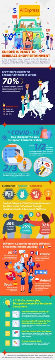 Forrester Consulting, wiodąca firma badań rynku, przeprowadziła na zlecenie AliExpress analizę trendu związanego z rozrywką zakupową w Europie. W badaniu wzięło udział ponad 14 tysięcy osób z Francji, Polski, Hiszpanii i Wielkiej Brytanii. Wyniki sugerują, że konsumenci są otwarci na eksperymentowanie z nowymi formami robienia zakupów online. Dwie trzecie ankietowanych zaczęło kupować coraz więcej przez Internet. W przypadku rozrywki zakupowej – 70% konsumentów wyraziło zainteresowanie nową formą e-zakupów.