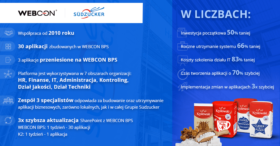 W procesie cyfryzacji Südzucker Polska od 2010 roku wspiera firma WEBCON, polski producent platformy low-code do digitalizacji i automatyzacji procesów biznesowych. Technologia ta pozwala na budowanie aplikacji biznesowych szybko i elastycznie, bez kodowania. Dzięki temu od chwili zgłoszenia przez biznes pomysłu na aplikację do stworzenia jej prototypu mija zaledwie kilka godzin, a nie tygodnie czy miesiące. Co więcej, dział IT może w oparciu o jedno narzędzie prowadzić zarówno skomplikowane projekty o charakterze kluczowym dla rozwoju firmy, jak i proste automatyzacje błyskawicznie usprawniające codzienne działania.