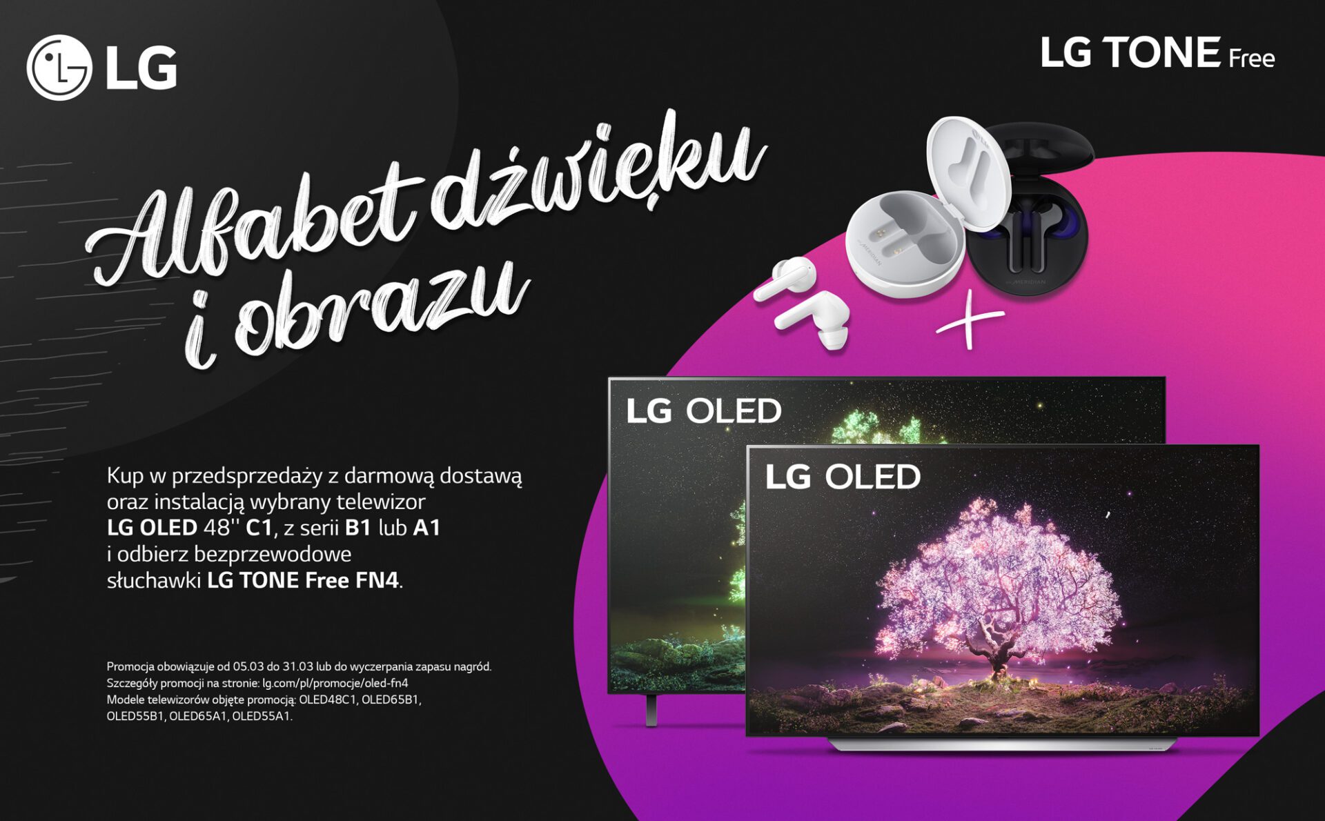 Klienci, którzy zakupią w przedsprzedaży telewizor LG OLED C1 48”, jeden z modeli serii LG OLED B1 lub LG OLED A1 otrzymają darmową dostawę i instalację telewizora oraz słuchawki LG TONE Free FN4, w których o jakość dźwięku zadbała firma Meridian.