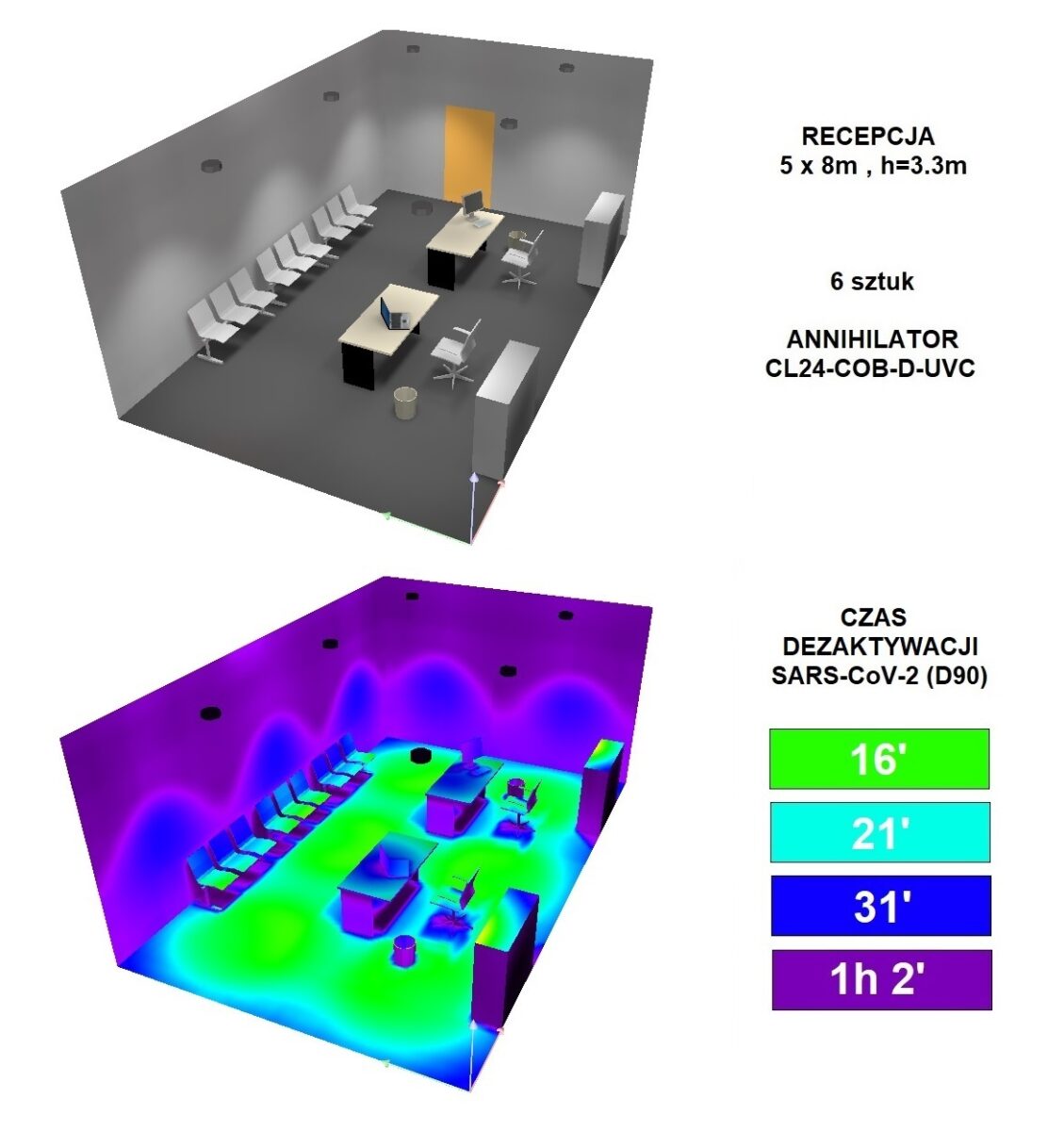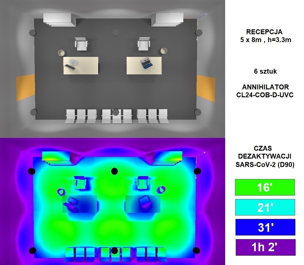 Wymagany czas dla skutecznej dezynfekcji powierzchni wynosi od 10 minut do 6 godzin i jest on szczegółowo określony w każdej indywidualnej symulacji dostarczanej klientowi. Średni, zalecany przez Lumenmax czas procesu dezynfekcji UVC wynosi 3 godziny. Pamiętać należy, że czas odkażania powietrza przez które przenika promieniowanie UVC, jest o wiele krótszy. Skuteczność zwalczania patogenów występujących w powietrzu, w wyniku bezpośredniego ciągłego promieniowania nadfioletowego, jest nieporównywalnie większa i bardziej dynamiczna od skuteczności przepływowych lamp dezynfekcyjnych UV oraz ozonatorów.