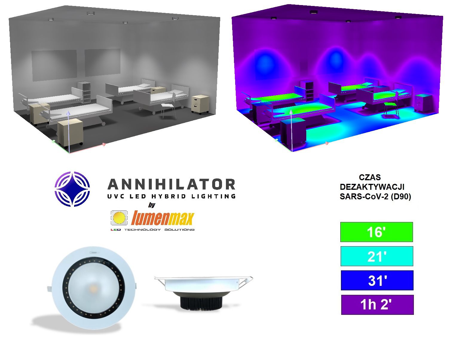 Annihilator Lumenmax to system sufitowych, hybrydowych opraw oświetleniowo – dezynfekcyjnych typu downlight LED, występujących w wersji natynkowej, podwieszanej oraz w wersji wpuszczanej w sufit podwieszony. Oprawy te, skutecznie oświetlą i odkażą każde pomieszczenie z wysokości wynoszącej nawet dwudziestu pięciu metrów.