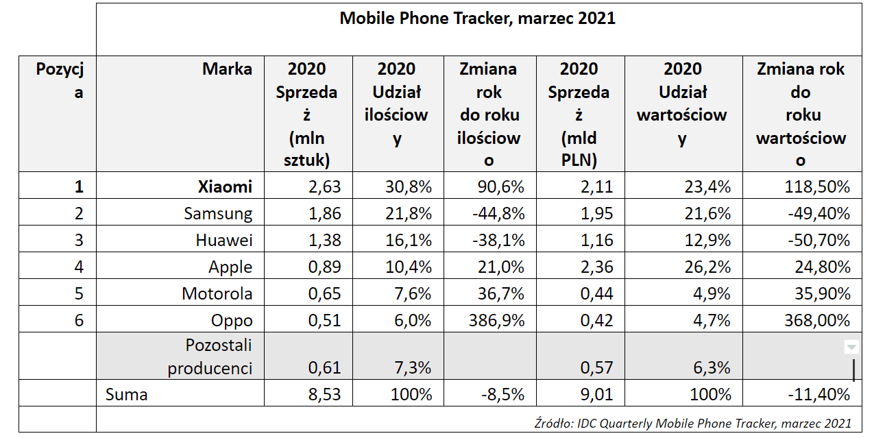 Pod kątem wartości sprzedanych smartfonów Xiaomi zajęło miejsce trzecie, za Apple i Samsungiem, co jednak nie dziwi, jeśli weźmiemy pod uwagę strategię cenową marki, szczególnie rezygnację z bardzo wysokich marż. Nie przeszkodziło to Xiaomi osiągnąć wartość sprzedaży większą o 118% w porównaniu do roku ubiegłego.