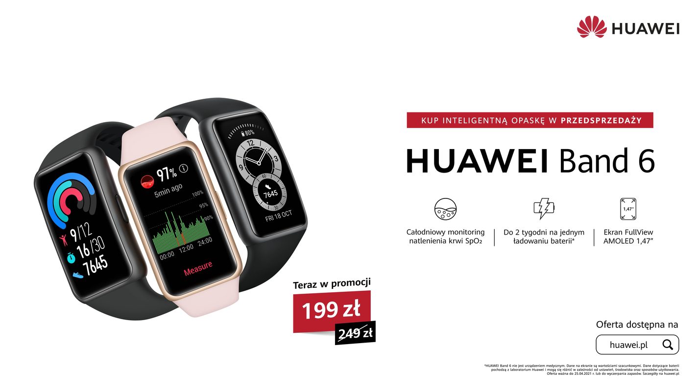 Najnowsza w portfolio Huawei inteligentna opaska sportowa, Huawei Band 6, dostępna jest od dzisiaj do 25 kwietnia w atrakcyjnej ofercie w rekomendowanej cenie 199 zł. W opasce zastosowano duży ekran 1,47 cala oraz wydajną baterię, dzięki której urządzenie może pracować nawet do dwóch tygodni na jednym ładowaniu. Huawei Band 6 umożliwia m.in. całodobowy monitoring natlenienia krwi SpO2, analizę tętna, a także pomiar efektów treningów. Konsumenci mogą wybierać między dwoma kolorami opaski, różowym i czarnym.
