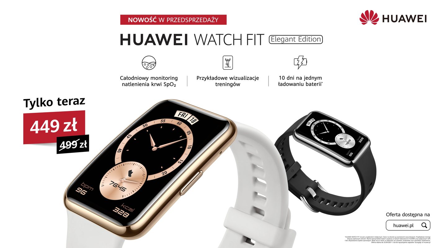 Huawei Watch Fit Elegant, inteligentny smartwatch dla fanów fitness w nowym, eleganckim wydaniu, dostępny jest od dzisiaj do 25 kwietnia w atrakcyjnej ofercie w rekomendowanej cenie 449 zł. Watch Fit Elegant wyróżnia się nowym designem – ramka jego koperty została wykonana ze stali nierdzewnej, a pasek z wytrzymałego fluoroelastomeru. Smartwatch dostępny jest w dwóch kolorach, czarnym i białym.
