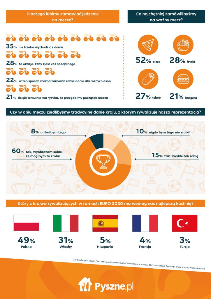 Ponad 90% Polaków zamierza jeść przed, w trakcie lub po meczu, a prawie połowa przyznaje, że nie wyobraża sobie oglądania sportowego widowiska bez jedzenia. Ulubionym momentem na konsumpcję jest dla co drugiej osoby początek i pierwsza połowa spotkania dwóch reprezentacji. Ze względu na wygodę, potrzebę zrelaksowania się i skupienia na meczu oraz chęć spróbowania z tej okazji czegoś specjalnego, co czwarty z nas planuje zamówić na mecz jedzenie z dowozem.