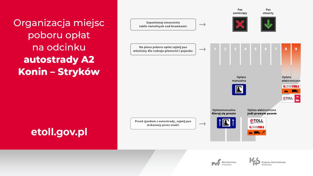 Od dziś użytkownicy pojazdów lekkich (poniżej 3,5 tony) posiadający spersonalizowane urządzenie viaAUTO lub posiadający bezpłatną aplikację e-TOLL PL mogą korzystać z systemu e-TOLL na autostradach A2 Konin-Stryków i A4 Wrocław-Sośnica, poruszając się dedykowanymi oznaczonymi pasami ruchu. Organizacja miejsc poboru opłat na Konin-Stryków (A2) oraz Bielany Wrocławskie-Sośnica (A4)