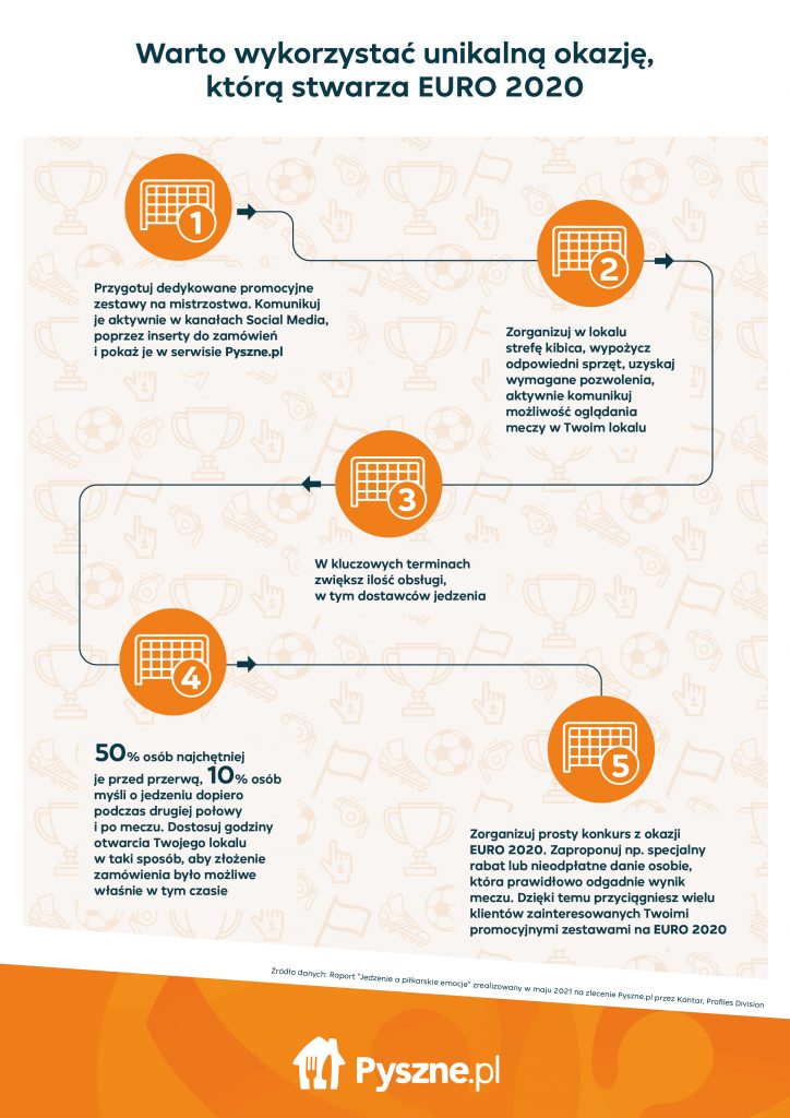 Zależy nam, żeby każda restauracja mogła skorzystać z wyjątkowej szansy, jaką jest EURO 2020. Dlatego przygotowaliśmy garść informacji i propozycji, które mają potencjał zwiększyć sprzedaż restauracji w tych dniach zarówno na miejscu w lokalu, jak i online. Warto skorzystać także z naszego przedłużonego pakietu wsparcia dla restauracji, który uruchomiliśmy podczas lockdownu – niezależne lokale, które dołączą do Pyszne.pl do końca czerwca nie płacą prowizji od zamówień złożonych w pierwszym miesiącu ich aktywności na naszej platformie” – kończy Jastrzębska.
