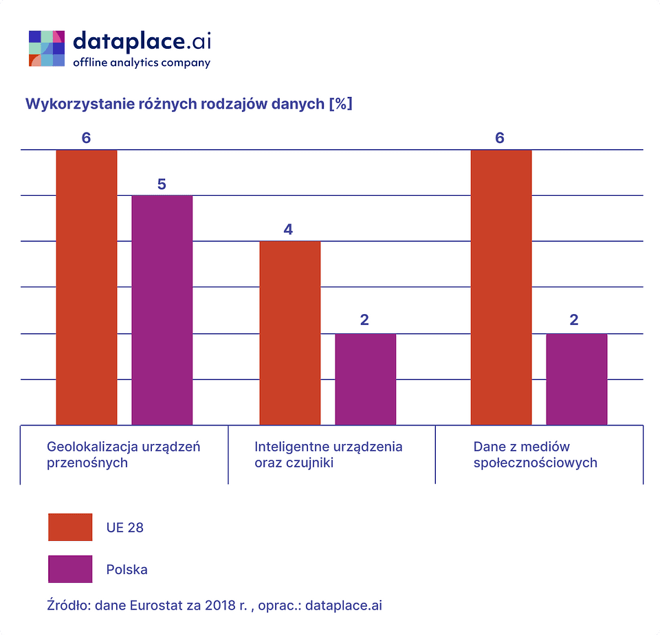 Z raportu Digital Poland wynika, że polscy przedsiębiorcy sięgają najczęściej po informacje geolokalizacyjne pochodzące z urządzeń mobilnych (5 proc.) i w tym przypadku wypadają podobnie jak średnia dla krajów Unii Europejskiej (6 proc.). Z kolei wykorzystanie danych z social media czy z czujników i inteligentnych urządzeń jest w Polsce na poziomie 2 proc. podczas gdy średnia dla krajów UE wynosi odpowiednio 6 proc. i 4 proc.