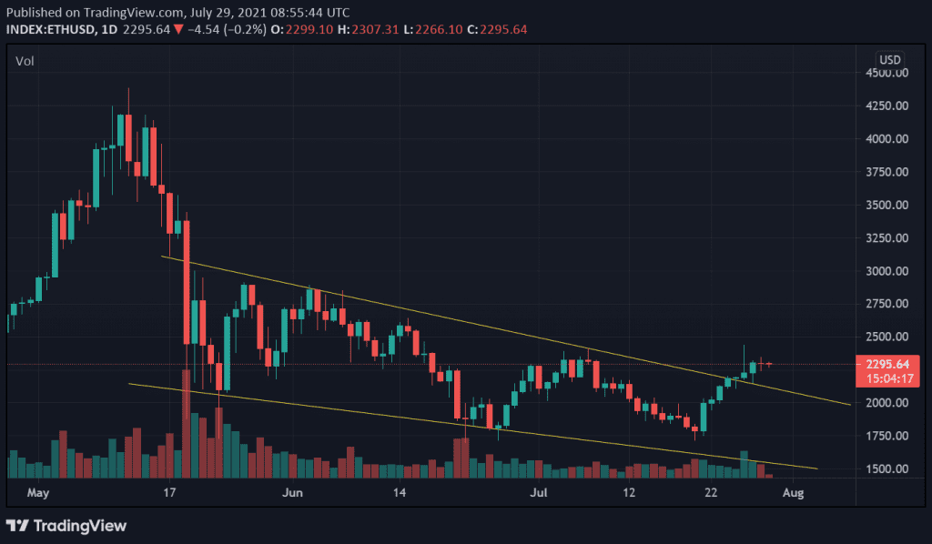 Rynek potrzebował około dwóch miesięcy na zbudowanie podstaw dla impulsywnego ruchu w góre. Ethereum podążyło za Bitcoinem i wyrwało się powyżej formacji zniżkującego klina, formującej się od połowy maja. Druga największa kryptowaluta pod względem kapitalizacji rynkowej zyskała 35 proc. w zeszłym tygodniu i znalazła się powyżej swoich maksimów z lipca.