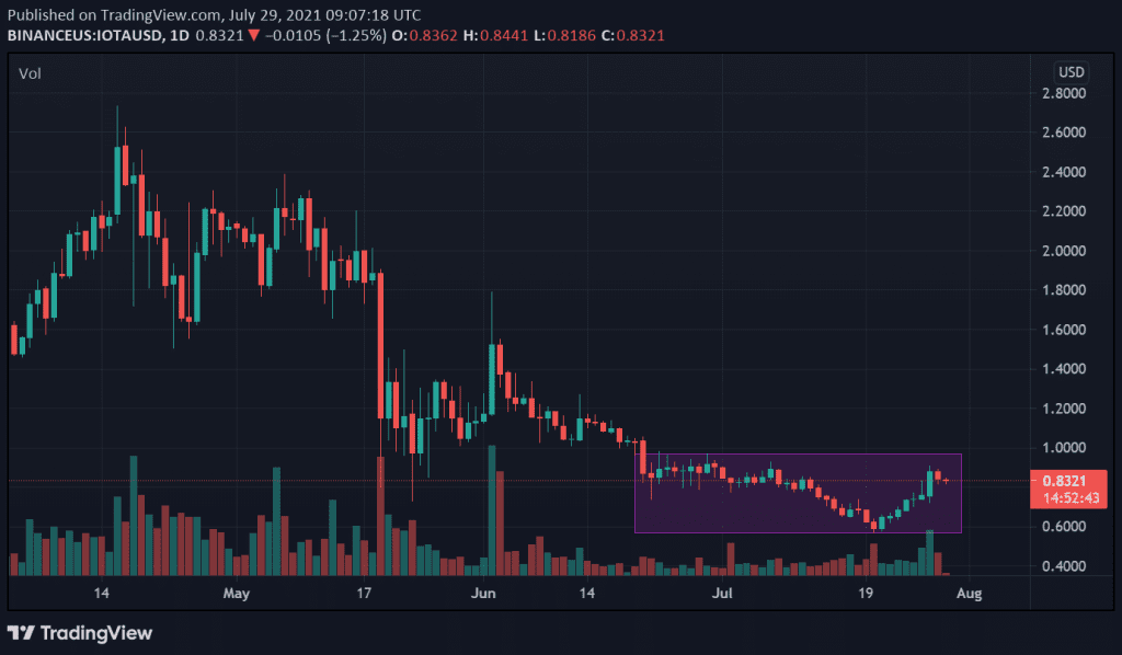 Do rajdu altcoinów dołączyła IOTA, której notowania poszybowały do górnych granic przedziału konsolidacyjnego. Kupujący popchnęli cenę powyżej 0,8 dolarów, co stanowi wzrost o prawie 50 proc. w ciągu ostatnich siedmiu dni.