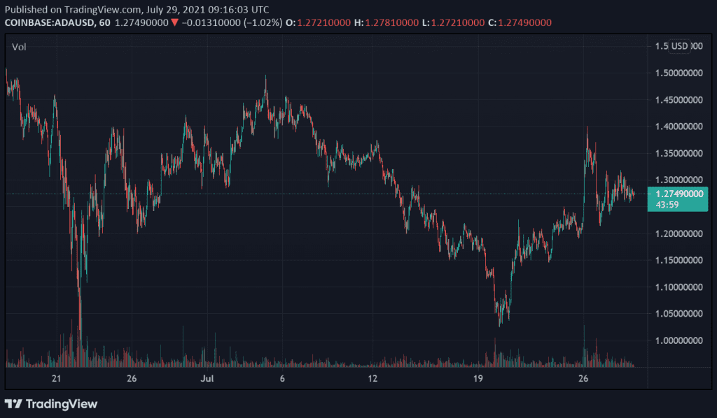 Cena Cardano wzrosła o 37 proc. od 20 do 26 lipca i zamknęła się nieco poniżej szczytu z 4 lipca na poziomie 1,45 USD. Poniżej ADA ma silne wsparcie na poziomie około 1,15 USD.Cardano niedawno ogłosiło, że z powodzeniem przeprowadziło Hard Fork Alonzo i że do tej pory nie było żadnych problemów spowodowanych przez aktualizację. Funkcja ta jest kolejnym krokiem w zbliżaniu sieci Cardano do kompatybilności z inteligentnymi kontraktami. Według Cardano, sieć będzie w stanie w pełni obsługiwać inteligentne kontrakty do września 2021 roku.
