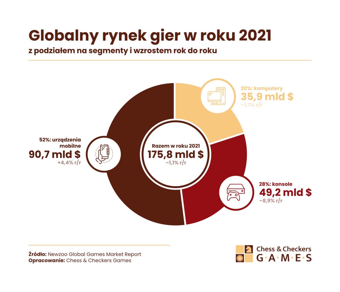 90,7 mld dolarów wart jest rynek gier na urządzenia mobilne. Według najnowszego raportu agencji Newzoo wartość rynku gier na konsole to 49,2 mld dol., a dla gier na komputery PC 35,9 mld dol. Sektor mobilny jako jedyny odnotował wzrost rok do roku i ma obecnie 52 proc. udziału w całym rynku gier. W czasie pandemii napędzały go zwłaszcza proste smartfonowe gry casual.