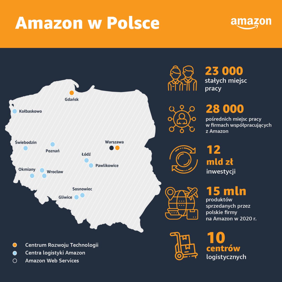 Amazon ogłosił, że od 2020 r. stworzył w Polsce 5 000 nowych miejsc pracy, zwiększając liczbę stałych miejsc pracy w kraju do 23 000. Są to stanowiska dla osób z różnych środowisk, o różnym stopniu wykształcenia, doświadczeniu i kompetencjach – od pracowników poziomu początkowego po specjalistów – zatrudnionych w centrach logistyki na terenie całego kraju, biurach, działach obsługi klienta, a także w Centrum Rozwoju Technologii i Amazon Web Services.