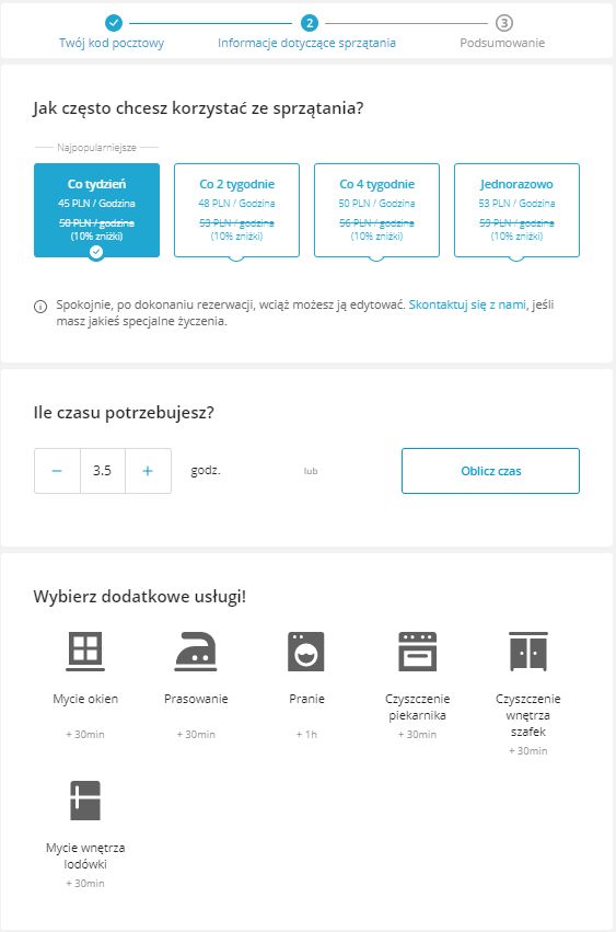 ● Wskazujemy czy chcemy skorzystać z usług dodatkowych. Dostępne są: mycie okien, prasowanie, pranie, czyszczenie piekarnika, wnętrz szafek czy mycie lodówki.