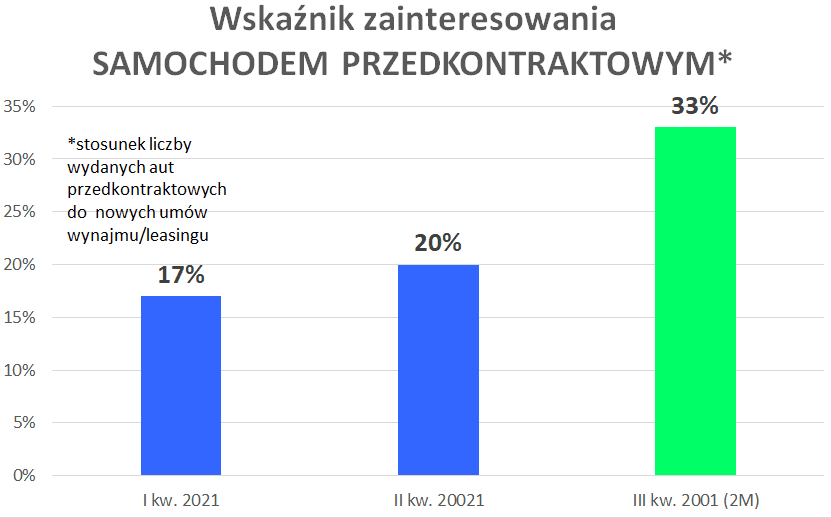 W lipcu i w sierpniu liczba klientów korzystających z tzw. auta przedkontraktowego osiągnęła absolutny rekord – 33%. Tyle wyniósł stosunek wydanych samochodów przedkontraktowych do liczby nowych umów leasingu i wynajmu zawartych za pośrednictwem platformy Carsmile. W pierwszym kwartale br. tak liczony wskaźnik wyniósł 17%, a w drugim kwartale – gdy problemy z dostępnością aut były już odczuwalne na rynku – wzrósł do 20%.