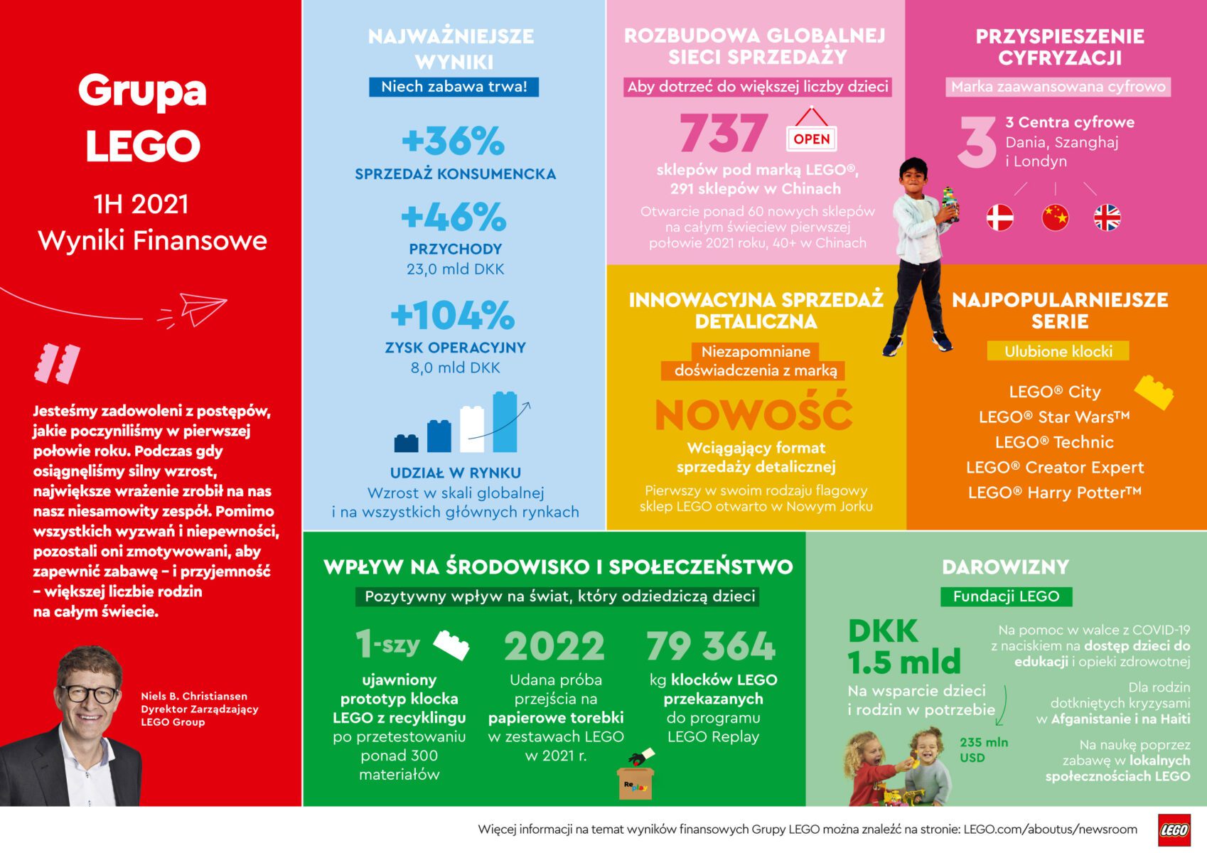 Jesteśmy niezwykle zadowoleni z postępu osiągniętego we wszystkich obszarach działalności w pierwszej połowie roku. Nasze wyniki napędzane były przez niegasnący popyt na produkty z portfolio LEGO®, które przyciągnęły nowych chętnych do budowania. Tegoroczny wzrost jest efektem zmniejszonej liczby restrykcji związanych z pandemią COVID-19 w porównaniu z rokiem ubiegłym, dzięki czemu nasze fabryki mogły pracować bez przeszkód. Mogliśmy również otworzyć większość sklepów stacjonarnych. Ponadto zobaczyliśmy korzyści płynące z wieloletnich inwestycji w obszar e-commerce, innowacje produktowe oraz wsparcie globalnego łańcucha dostaw. Obecne, wysokie wyniki finansowe pozwolą nam na wsparcie strategicznych inwestycji w zrównoważony rozwój oraz cyfryzację. Szczególnie wdzięczni jesteśmy naszym pracownikom. Pomimo wyzwań i niepewności, jakimi naznaczone było ostatnie sześć miesięcy, pracowali oni niezwykle ciężko, by przynosić radość rodzinom na całym świecie. – przyznaje Niels B. Christiansen, Dyrektor Zarządzający LEGO Group.