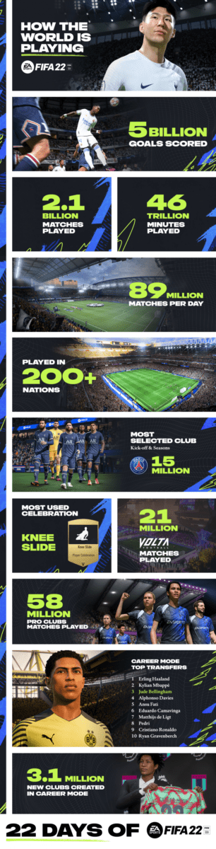 W trybie kariery w grze EA SPORTS FIFA 22 2,1 miliona graczy stworzyło już 3,1 miliona nowych klubów dzięki funkcji „Stwórz swój klub”. W Wirtualnych klubach rozegrano ponad 57,7 miliona meczów, w których stworzono ponad 326 tysięcy awatarów kobiet.