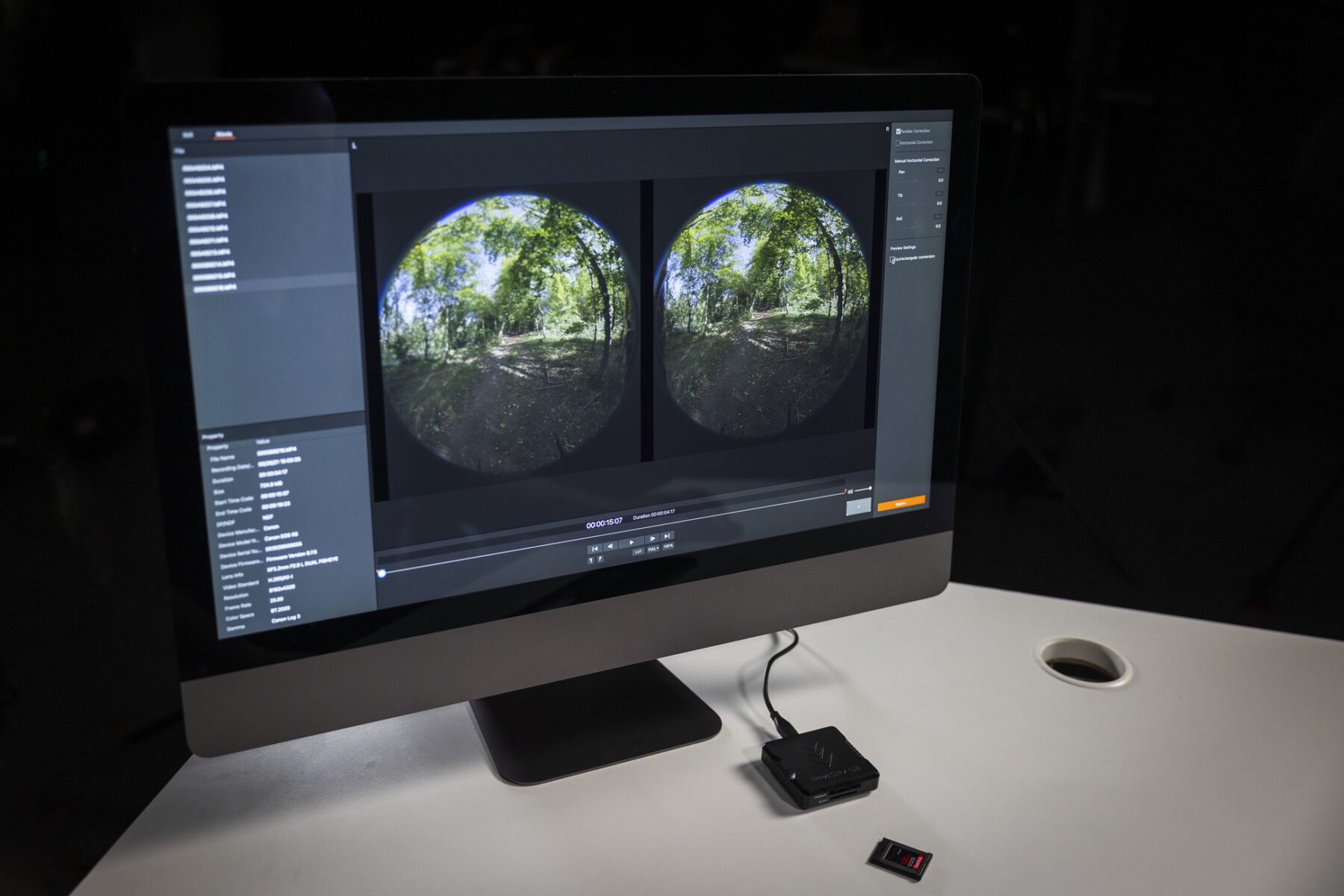 Nowy system Canon EOS VR wykorzystuje obiektyw Canon RF 5.2mm F2.8L DUAL FISHEYE w aparacie z jedną matrycą, co eliminuje potrzebę wyrównywania pozycji obiektywów, i oznacza, że dla lewego i prawego obrazu tworzony jest tylko jeden, doskonale zsynchronizowany plik. Dzięki temu oprogramowanie lub plug-in Canon może precyzyjnie konwertować podwójny okrągły format rybiego oka na standardowy format VR180°, gotowy do dalszej edycji w programie Adobe Premiere Pro lub oglądania na goglach VR.