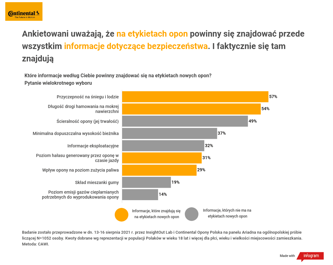 Ankietowani uważają, że na etykietach opon powinny znajdować się przede wszystkim informacje dotyczące poziomu bezpieczeństwa, zapewnianego przez konkretny model. W pytaniu wielokrotnego wyboru niemal tak samo ważne dla respondentów okazały się dane, dotyczące przyczepności na śniegu i lodzie (57 proc. wskazań), oraz drogi hamowania na mokrej nawierzchni (54 proc.). Nieco rzadziej respondenci wskazywali informacje na temat ścieralności opony (49 proc.). Spośród tych trzech najczęściej wskazywanych informacji tylko dwie pierwsze znajdują się obecnie na etykietach opon.