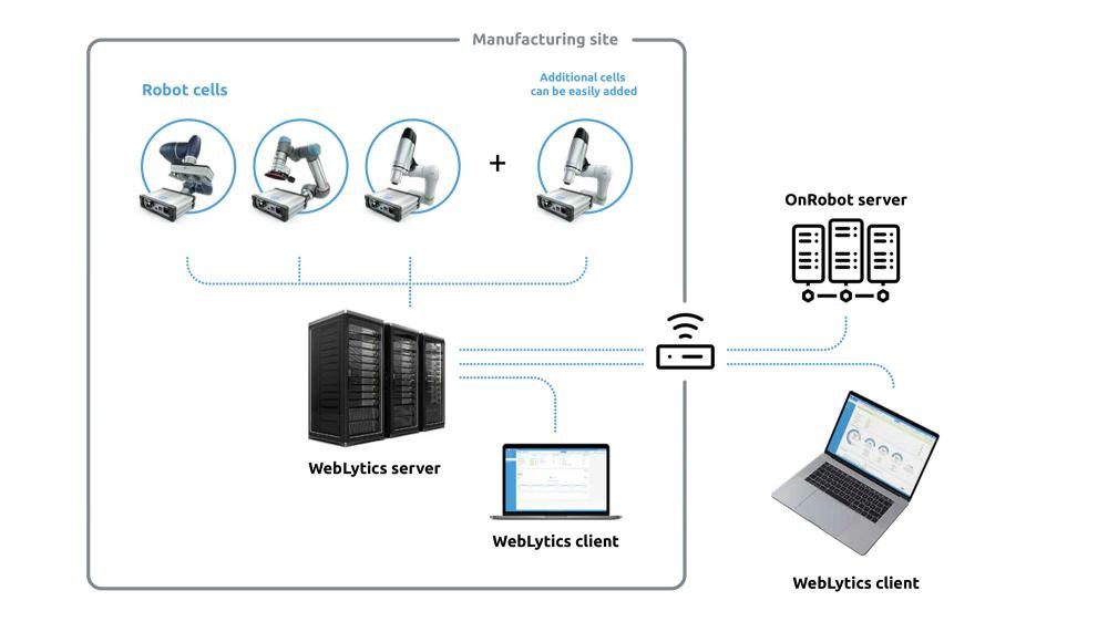 Serwer WebLytics może być wdrożony do lokalnej sieci hali produkcyjnej lub dodany do sieci wirtualnej, która łączy się ze stanowiskiem robotycznym. Zebrane dane są przechowywane lokalnie na serwerze WebLytics, podczas gdy wbudowany serwer WebLytics jest zawsze dostępny z sieci hali produkcyjnej lub z dowolnego miejsca na świecie poprzez bezpieczne połączenie HTTPS.