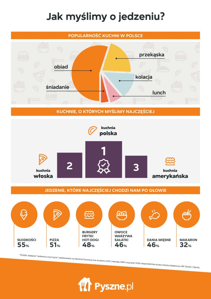 Jedzenie definiuje styl życia i stanowi sposób na wyrażanie siebie co czwartego Polaka — wynika z badania zrealizowanego na zlecenie Pyszne.pl. To także jeden z głównych tematów naszych rozmyślań w ciągu dnia. Idąc tym tropem, możemy powiedzieć, że nasze życie musi być niebywale słodkie, bo to właśnie desery są daniem, o którym ponad połowa z nas myśli najczęściej. Przeplatają je myśli o włoskim klasyku, czyli pizzy i amerykańskich kultowych daniach — hamburgerach czy hot-dogach.