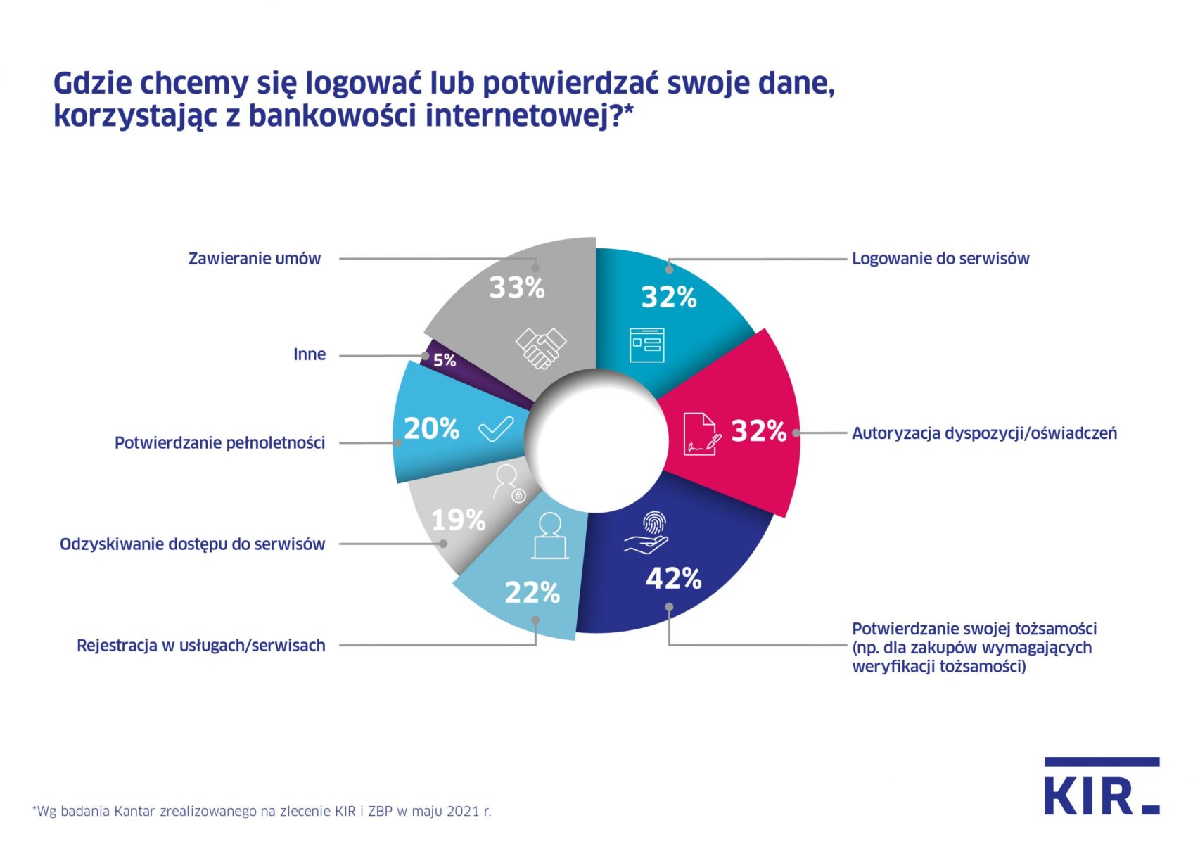 Badanie Kantar przynosi również odpowiedź na pytanie, do czego Polacy chcieliby wykorzystywać cyfrową tożsamość opartą o bankowość elektroniczną. W ubiegłym roku najczęściej wskazywaną odpowiedzią było logowanie do serwisów (38 proc.) oraz autoryzacja dyspozycji i oświadczeń (35 proc.), które w tegorocznej edycji uzyskały jednakowy wynik – po 32 proc. wskazań. Natomiast możliwość potwierdzania tożsamości np. przy zakupach online, którą rok temu wskazało 32 proc. ankietowanych, w roku 2021 zyskała na popularności – odpowiedź tę wskazało 42 proc. badanych.