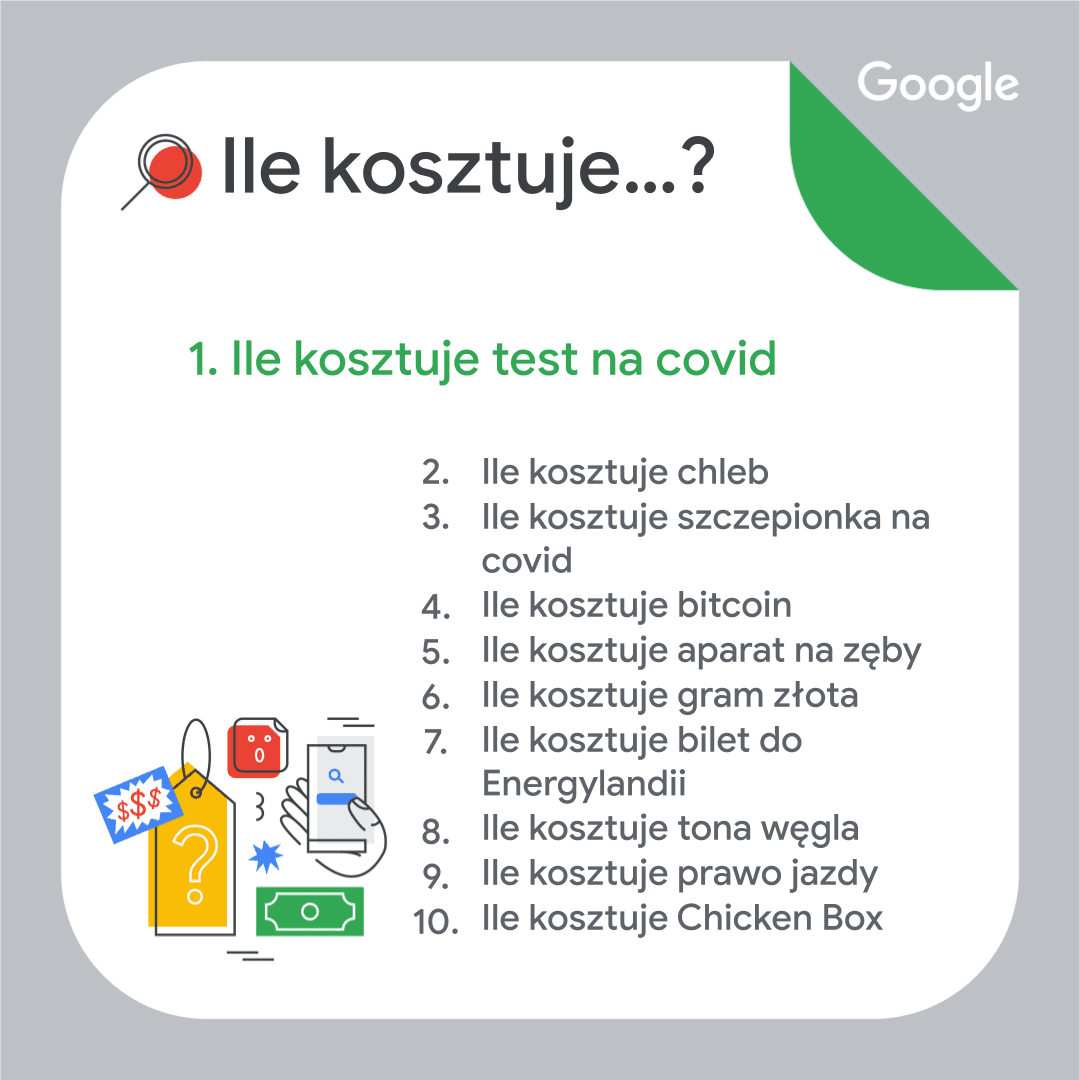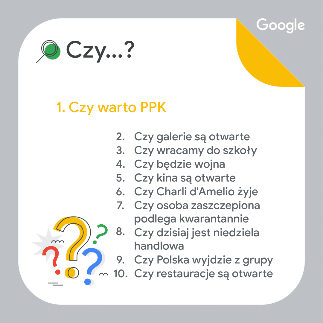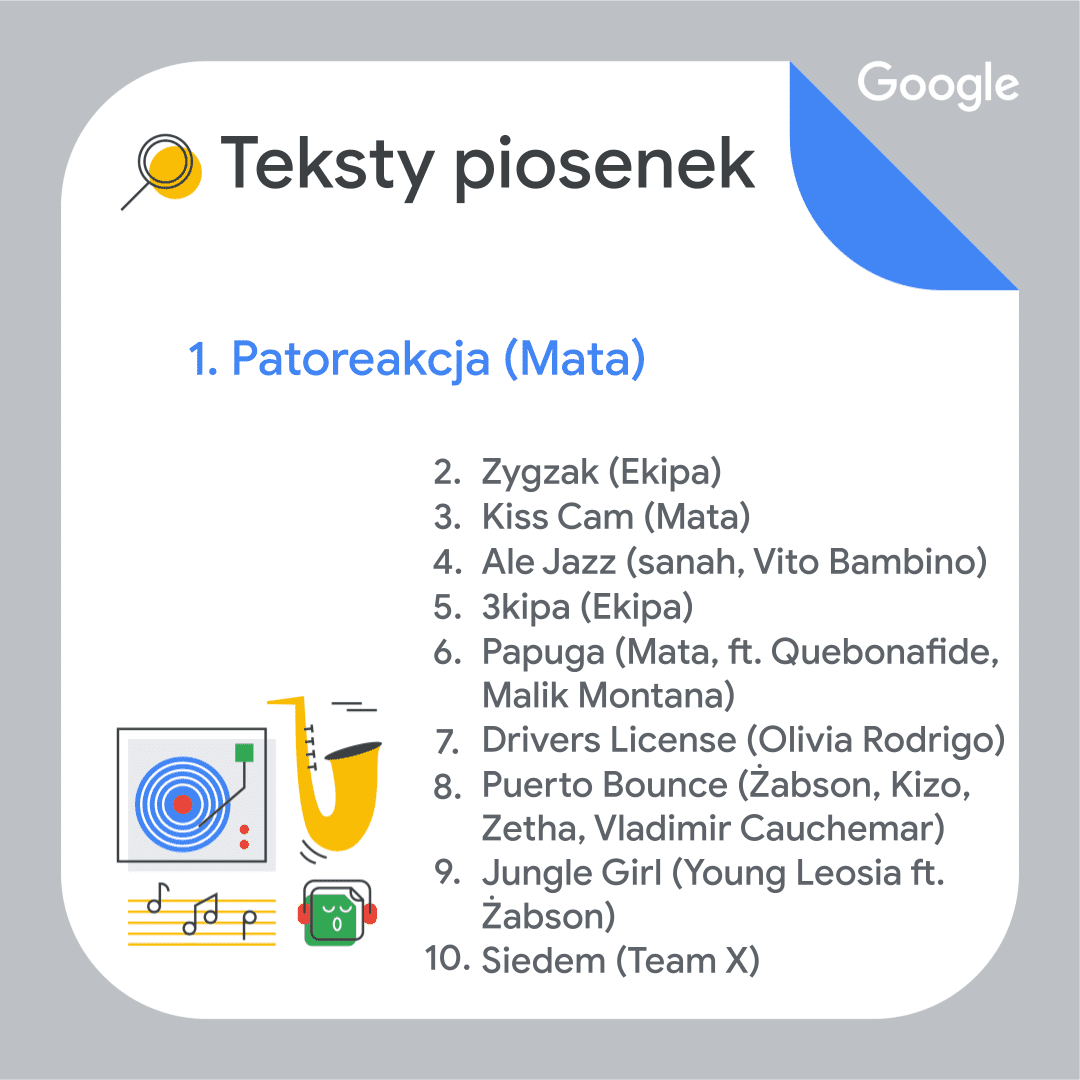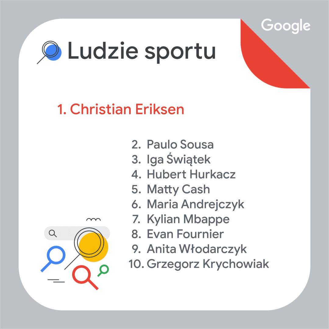 W Polsce najpopularniejsza okazała się piłka nożna. Hasło Euro 2020 znalazło się na pierwszym miejscu głównej listy podsumowania. Na świecie uplasowało się na piątym miejscu, ponadto wyszukiwano hasła związane z koszykówką (NBA) czy rozgrywkami w krykieta (T20 World Cup). Na polskiej liście pojawiły się również osoby, które odeszły: Krzysztof Krawczyk (2. miejsce) oraz Kamil Durczok (5. miejsce). W TOP 10 znaleźć można także hasła związane ze zdrowiem i szczepieniami: pacjent gov (4. miejsce) oraz loteria szczepionkowa (7. miejsce). W zestawieniu znalazły się dwa fenomeny — serialowy i marketingowy. Koreańska produkcja Squid Game podbiła internet (6. miejsce). Niewiele mniejszym zainteresowaniem cieszyły się lody Ekipy. Hasło to zamyka polskie zestawienie, ale także otwiera inne. Gdzie można kupić lody Ekipy? – to pytanie na pierwszym miejscu